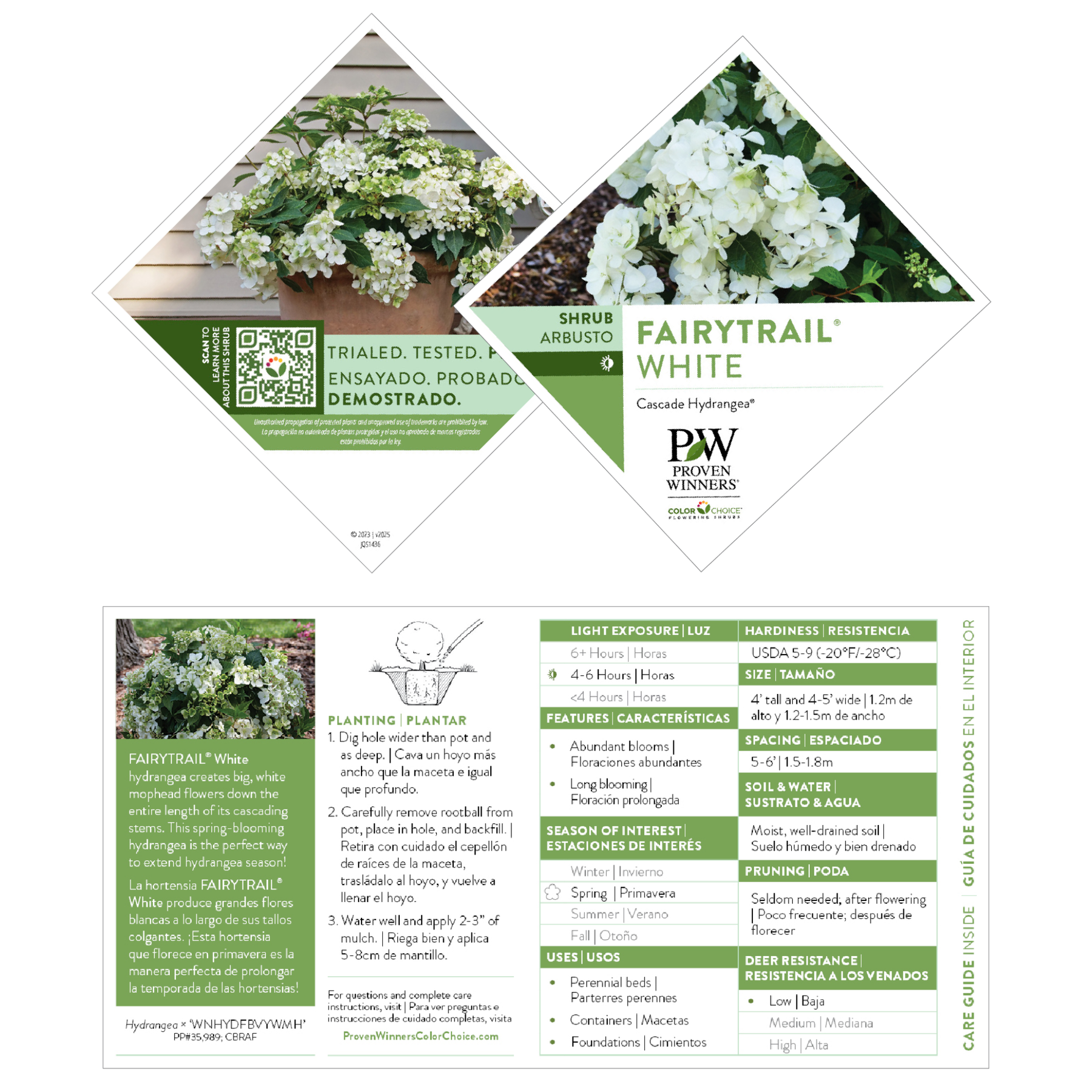 Add a touch of elegance to your garden with Fairytrail® White Cascade Hydrangea, one of the first Cascade Hydrangeas® to be introduced to North America. Its long, trailing stems are adorned with clusters of snowball-like white flowers at every leaf node, creating a breathtaking cascade of blooms in spring. The healthy foliage offers a lush backdrop for the rest of the season, making this hydrangea as beautiful as it is versatile. Perfect for hanging baskets, containers, cascading over retaining walls, or filling in mixed beds, Fairytrail® White is ready to dazzle in any garden design.