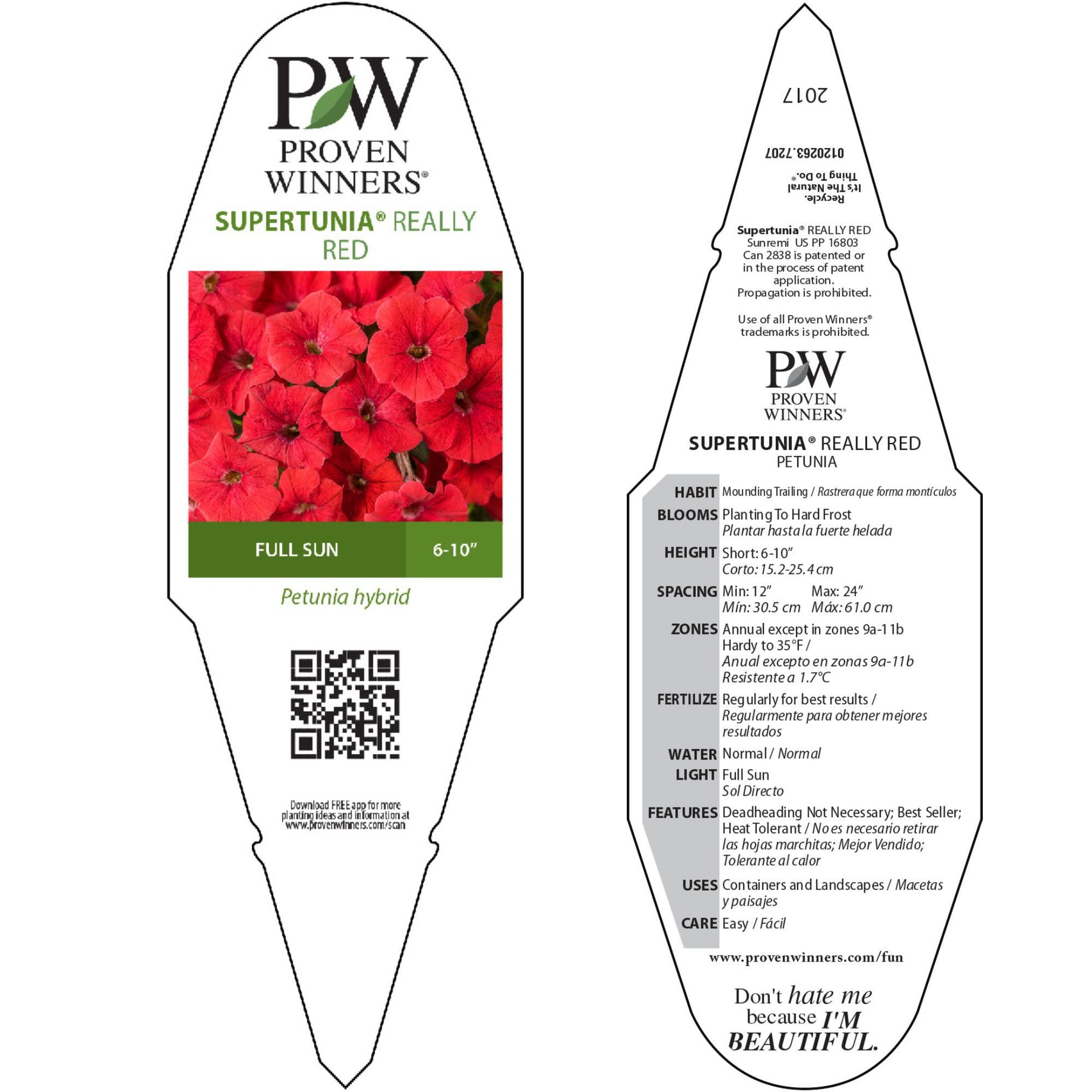 Supertunia® Really Red is striking and features uniform, true red flowers that bloom profusely all season long, creating a vibrant and bold statement in any garden. Known for their vigorous growth and slightly mounded habits, Supertunia petunias are perfect as both fillers and spillers in containers, providing lush, cascading beauty. They also make excellent landscape plants, especially when placed near the front of beds, where their vivid color can truly shine. This award-winning variety is heat and drought-tolerant, attracts pollinators, and requires no deadheading, making it a low-maintenance yet stunning addition to your outdoor space.