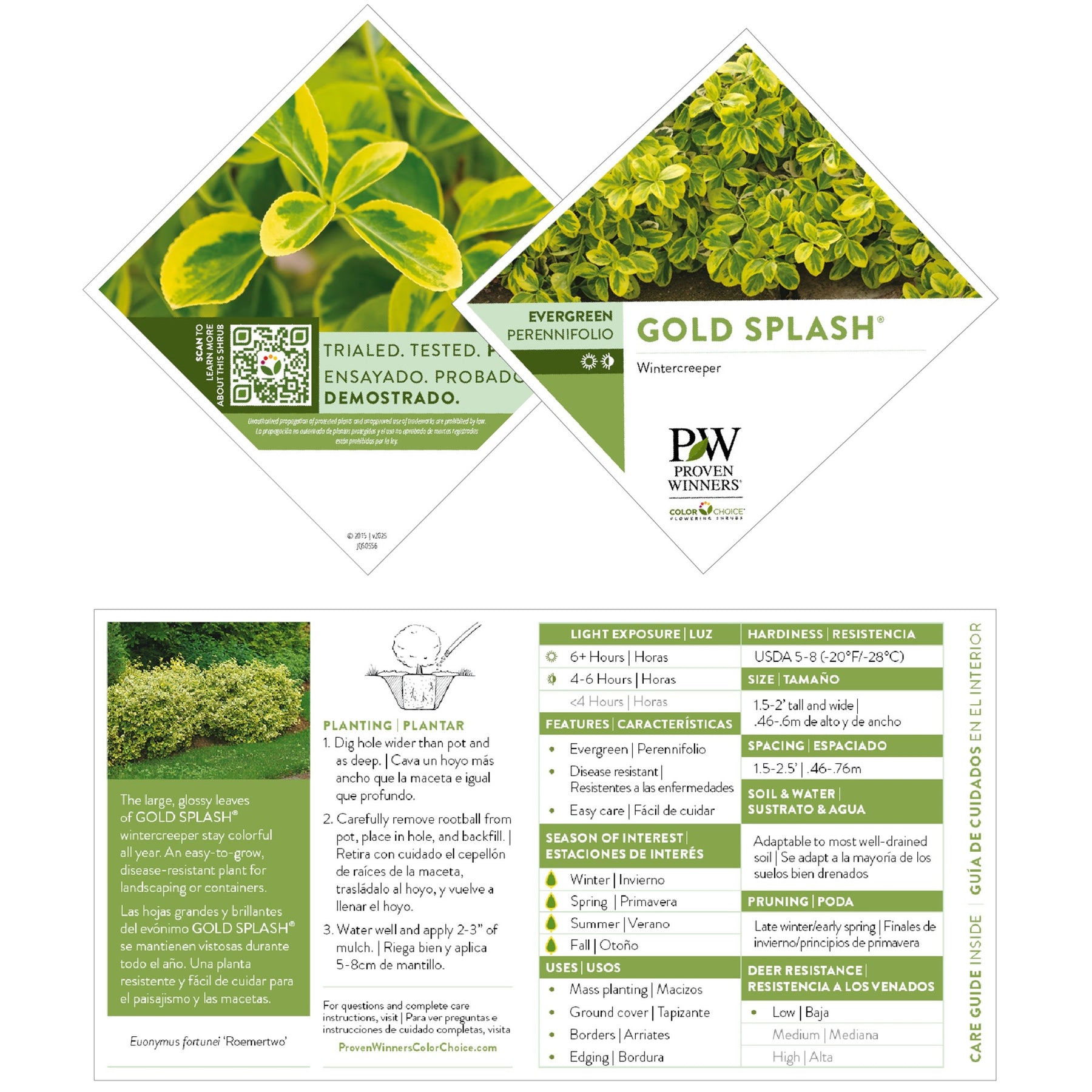 Gold Splash® Wintercreeper is a stunning evergreen groundcover that dazzles with its big, round leaves of soft green and vibrant yellow. This hardy plant maintains its cheerful variegated foliage throughout the year, adding a splash of color to any landscape in every season. Perfect for containers, garden beds, mass plantings, or borders, it thrives in a variety of settings. Its compact growth makes it an excellent choice for tight spaces, such as along sidewalks, where it can create a beautiful, low-maintenance display.