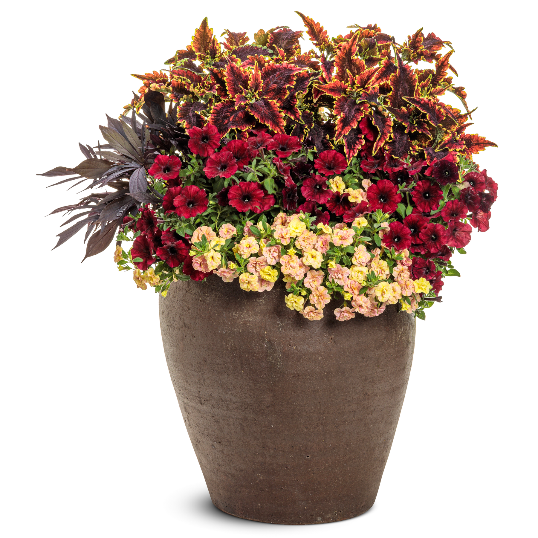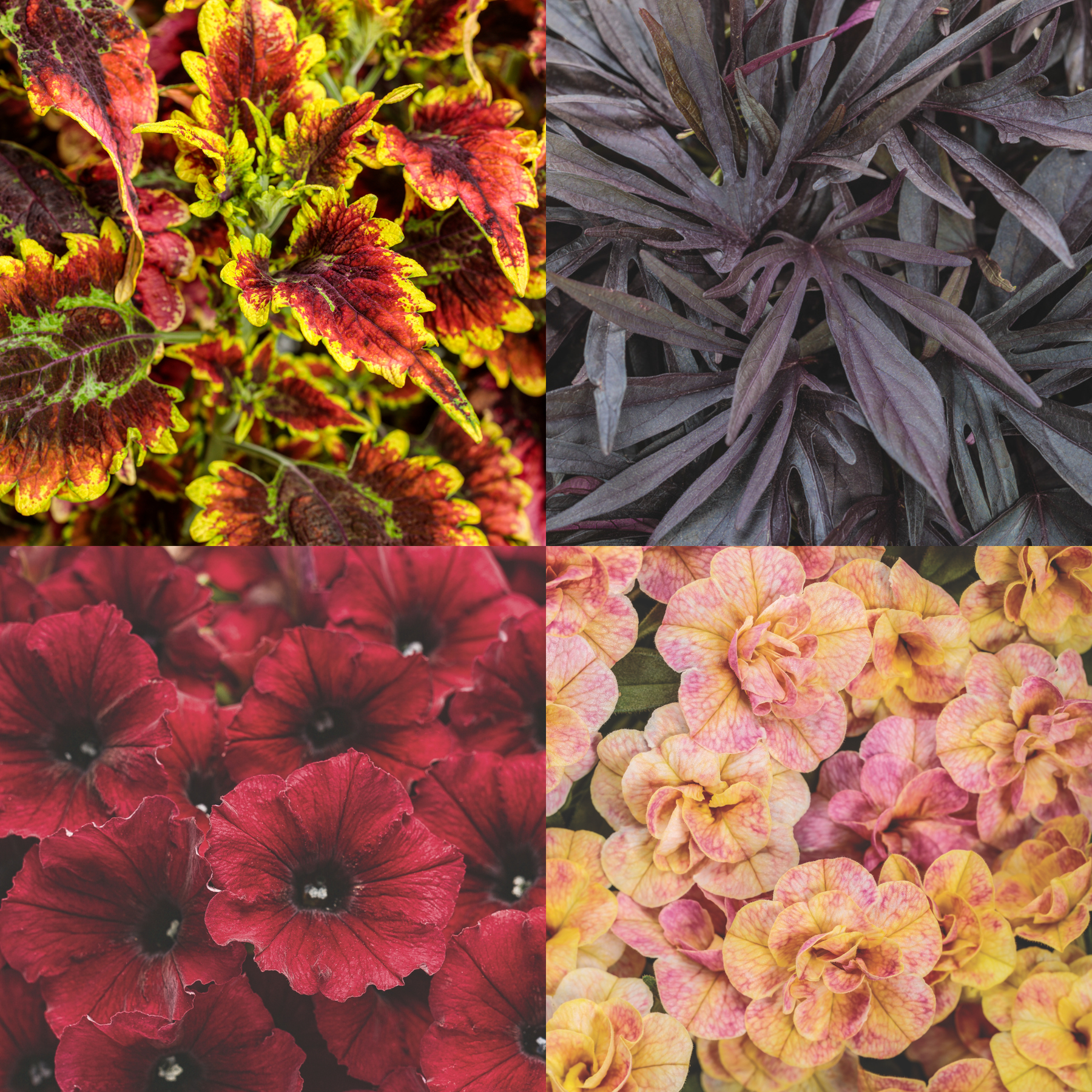 Supertunia® Black Cherry® Petunia (x2), Superbells Magic® Double Grapefruit Calibrachoa (x2) ColorBlaze® El Brighto Coleus (scutellarioides) (x1) and Sweet Caroline Medusa™ Black Ornamental Sweet Potato Vine (Ipomoea batatas) (x1)
