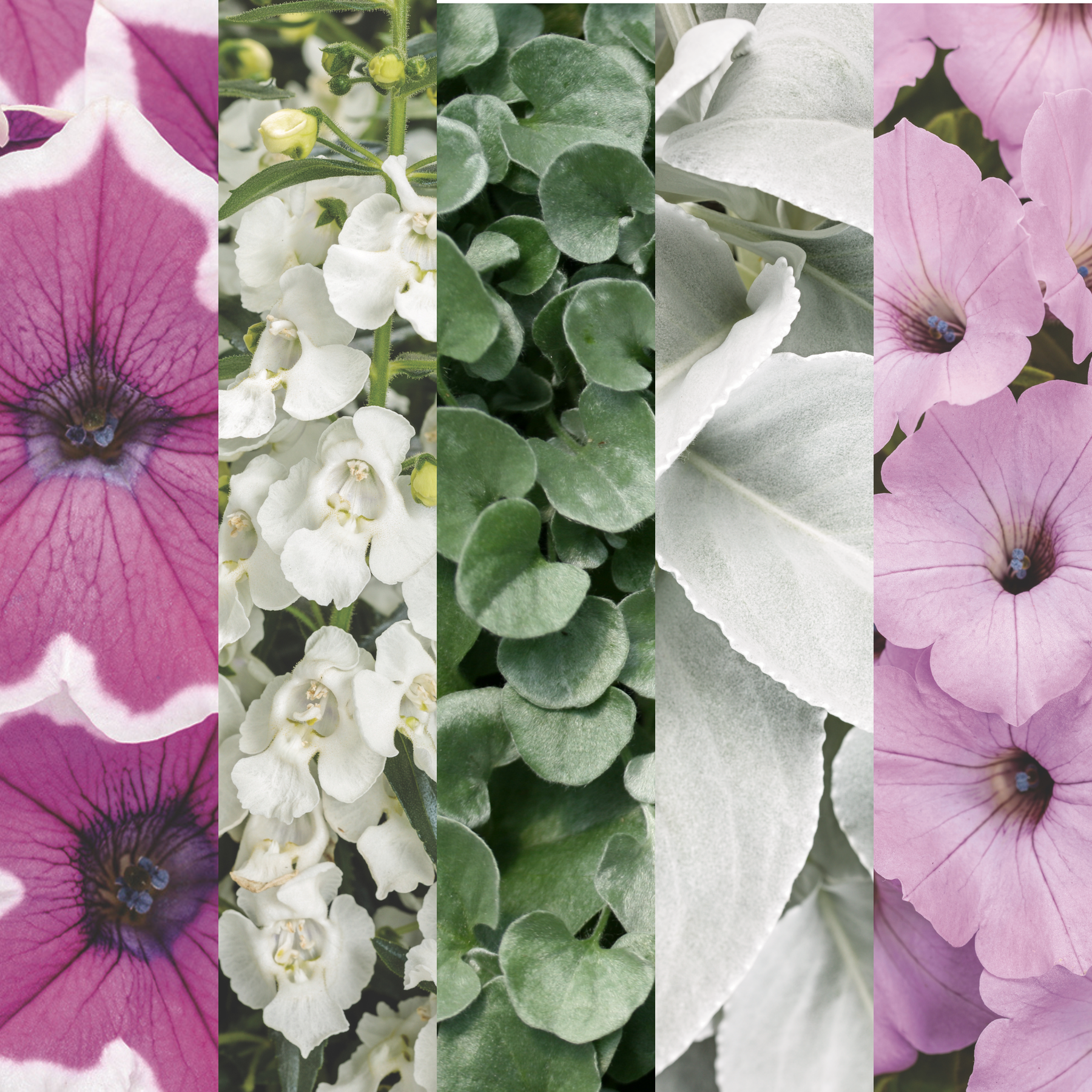 Supertunia Vista® Cool Jazz™ Petunia (x1), Supertunia® Hoopla® Vivid Orchid™ Petunia (x1), Silver Falls™ Silver Ponysfoot (Dichondra argentea) (x1), Angelface® White Summer Snapdragon (Angelonia) (x1) and Angel Wings Sea Cabbage (Senecio candicans) (x1)