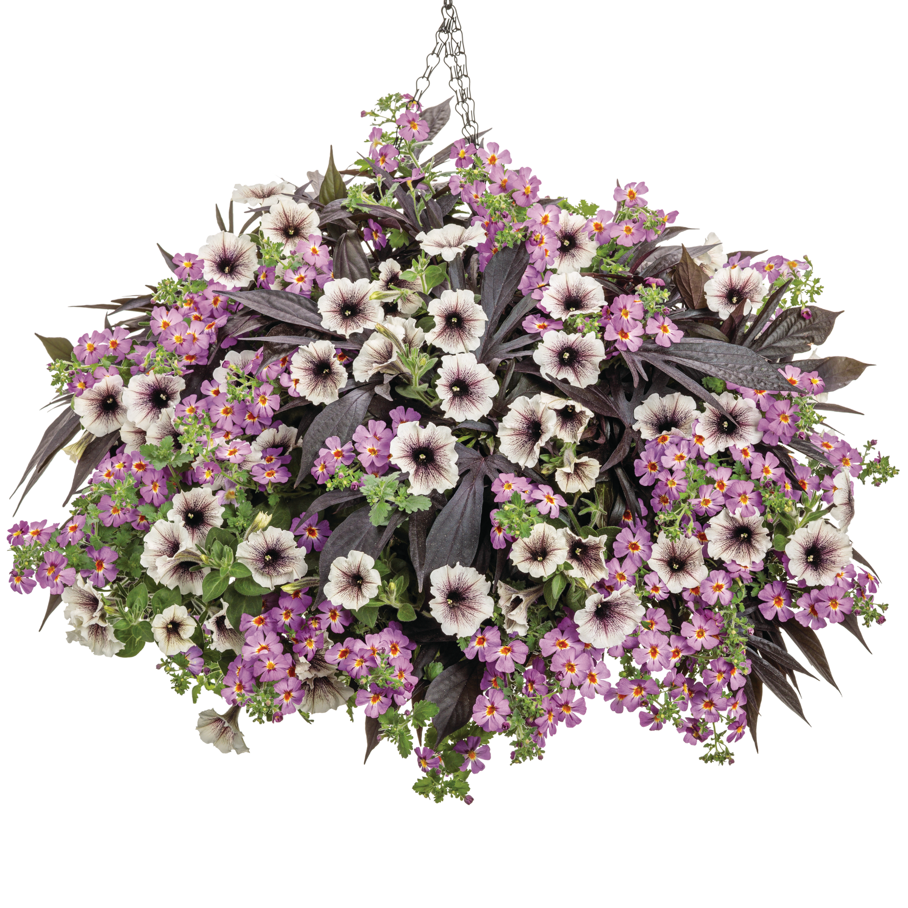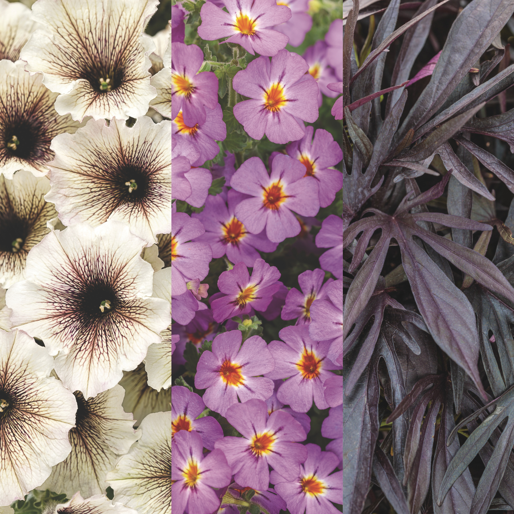 Supertunia® Latte™ Petunia (x2), Safari® Dusk South African Phlox (Jamesbrittenia hybrid) (x2) and Sweet Caroline Medusa™ Black Ornamental Sweet Potato Vine (Ipomoea batatas) (x2)