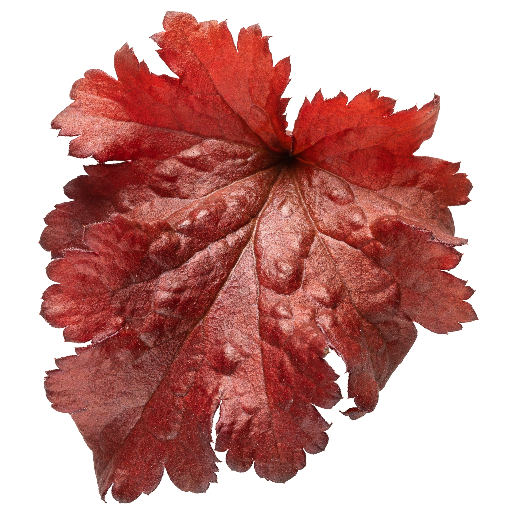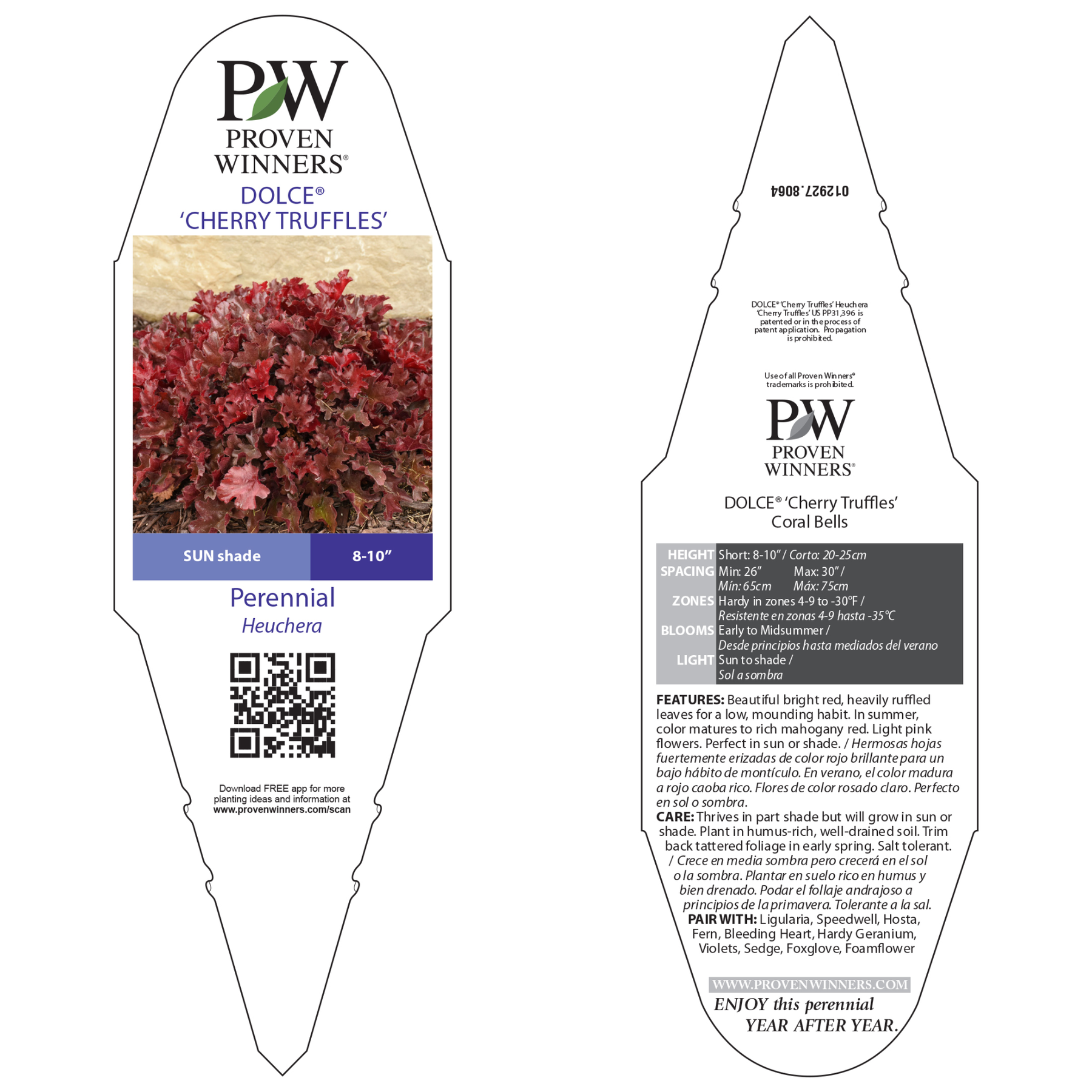 Dolce® 'Cherry Truffles' Coral Bells is a stunning perennial that adds a burst of vibrant color to any garden. Its new leaves emerge bright red, with a heavily ruffled texture, creating a lush, low, and mounding habit. As the season progresses, the foliage matures to a rich mahogany red, maintaining its striking hue throughout the summer. Dark burgundy stems support delicate, light pink flowers paired with deep rose calyxes, blooming from early to midsummer. Ideal for borders, containers, cut flower arrangements, edging, mass planting, or as a focal point, Cherry Truffles is a versatile and beautiful addition to any landscape.