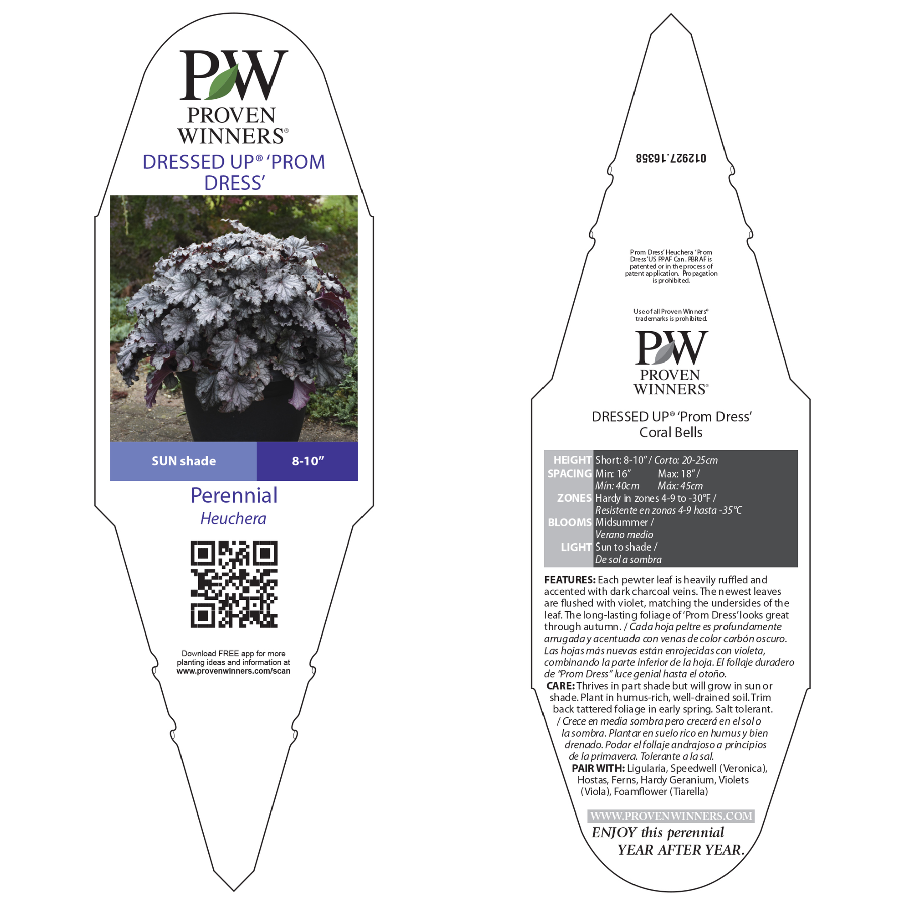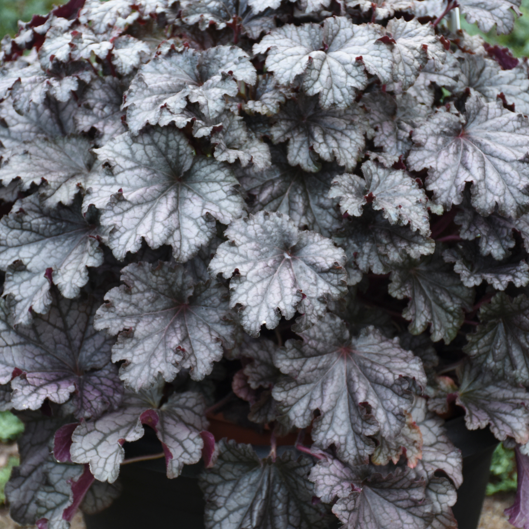 Step into elegance with Dressed Up® 'Prom Dress', a dazzling perennial that brings a touch of sophistication to any garden. Its sizeable silver leaves have a pewter-like sheen, heavily ruffled and highlighted by dark charcoal veins, giving it a refined, textured look. The newest leaves are beautifully flushed with violet, perfectly matching the undersides of the foliage for an added layer of color and intrigue.