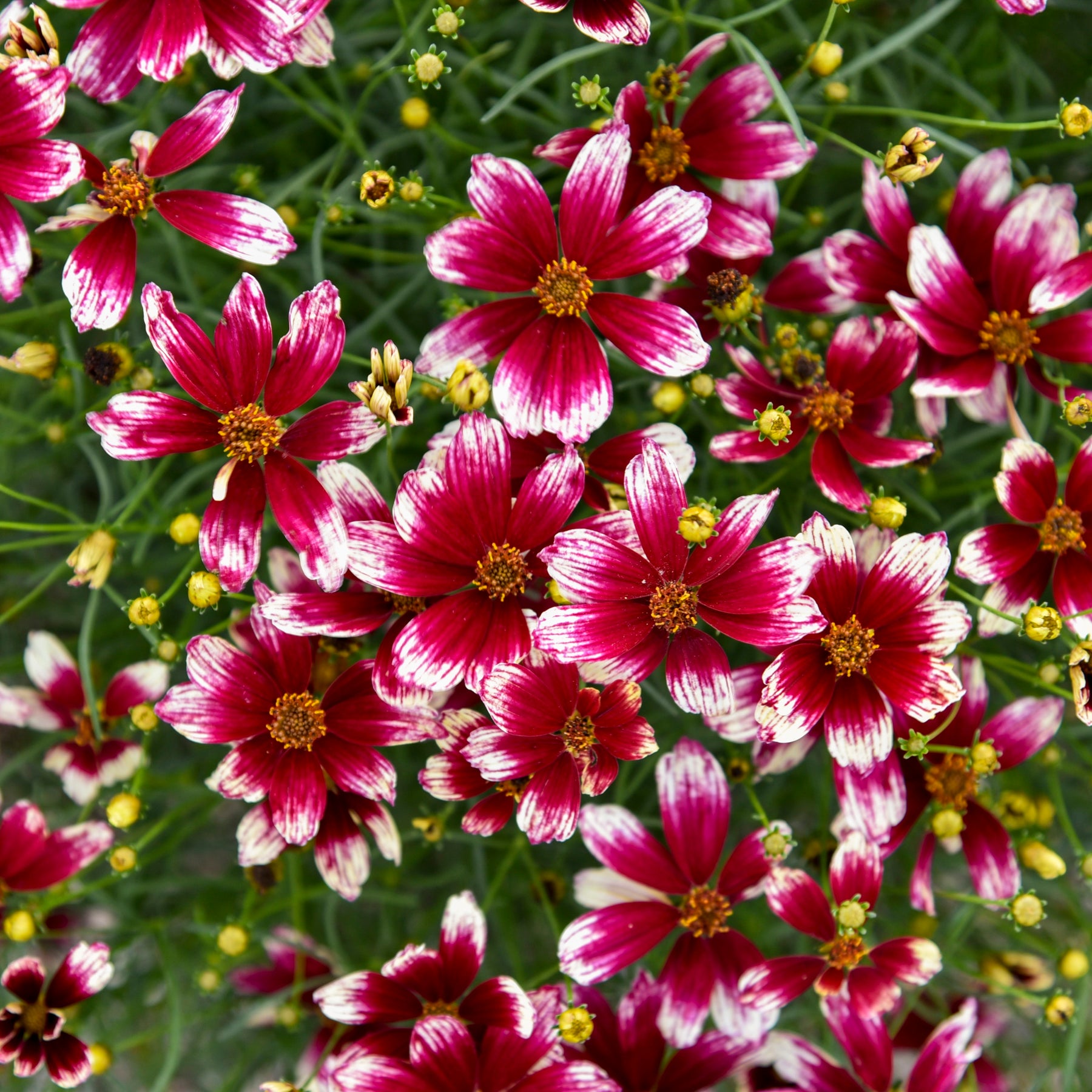 Meet 'Heartstrings' Coreopsis – a flower that tugs at your heart! These creamy blooms are graced with a striking dark reddish-pink eye that creates a beautiful contrast. The eye zone stretches almost to the tip of each petal, with delicate flecks that give the petals a lovely, textured appearance along the veins. But don’t let the delicate look fool you – 'Heartstrings' blooms persist for weeks, opening gracefully with wide, flat petals that last and last.