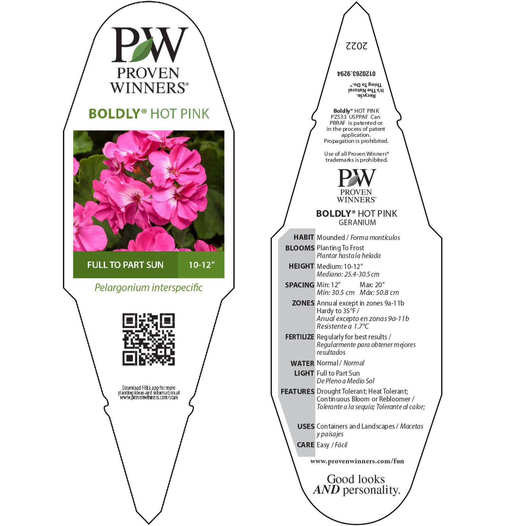 Boldly® Hot Pink Geranium features eye-catching, bright pink flowers that bloom abundantly throughout the season, adding a vibrant pop of color to any garden. Once established, it is heat and drought tolerant, making it a resilient choice for various climates. For optimal, continued blooming, regular deadheading is recommended. This versatile plant works beautifully as a filler in containers or as part of landscape designs, offering long-lasting beauty and a bold statement wherever it's planted.
