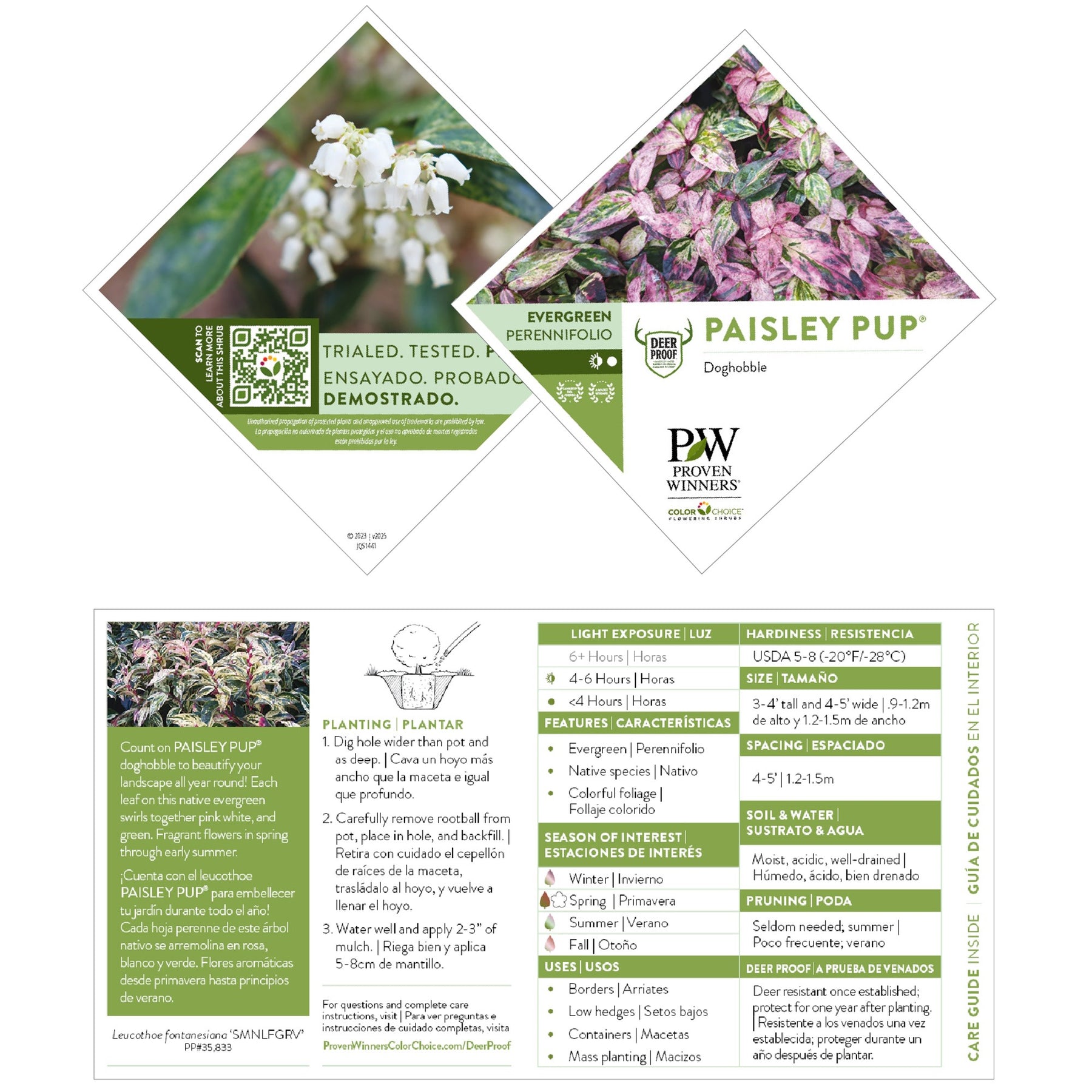 Ditch the typical and embrace the fantastical with Paisley Pup™ doghobble. This broadleaf evergreen is native to North America and is filled with eye-catching variegated foliage in shades of pink, green, cream, and bronze. Tiny bell-shaped blooms are strung along arching branches, feeding pollinators in the late springtime. Shade-tolerant, deer-resistant, and low-growing, Paisley Pup solves landscape woes with charm.