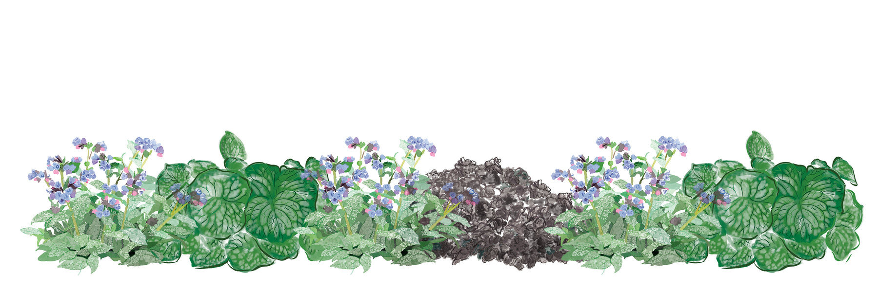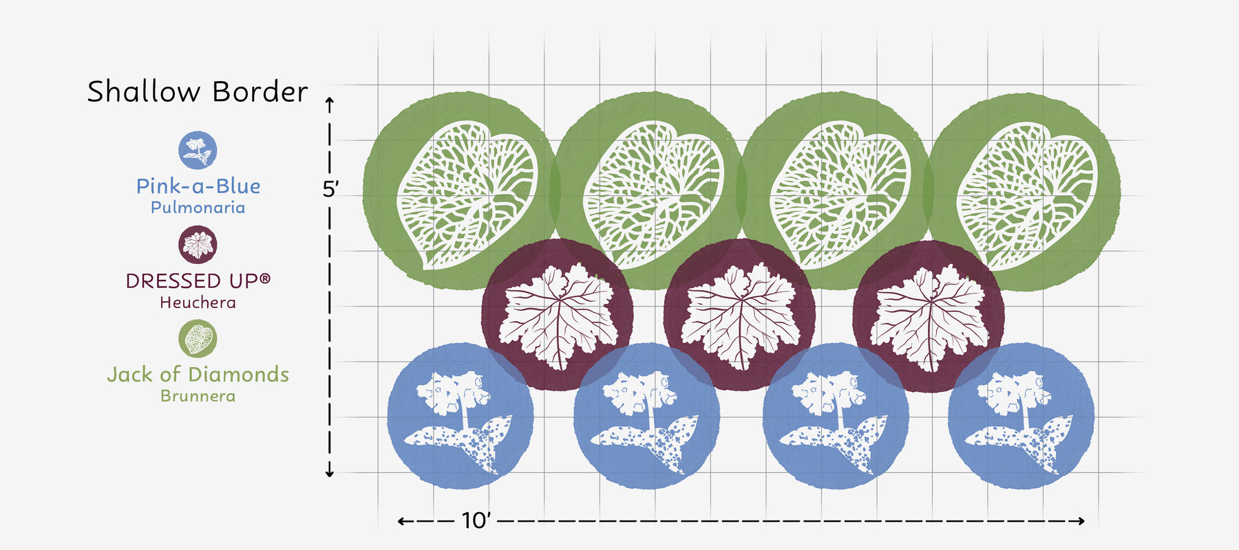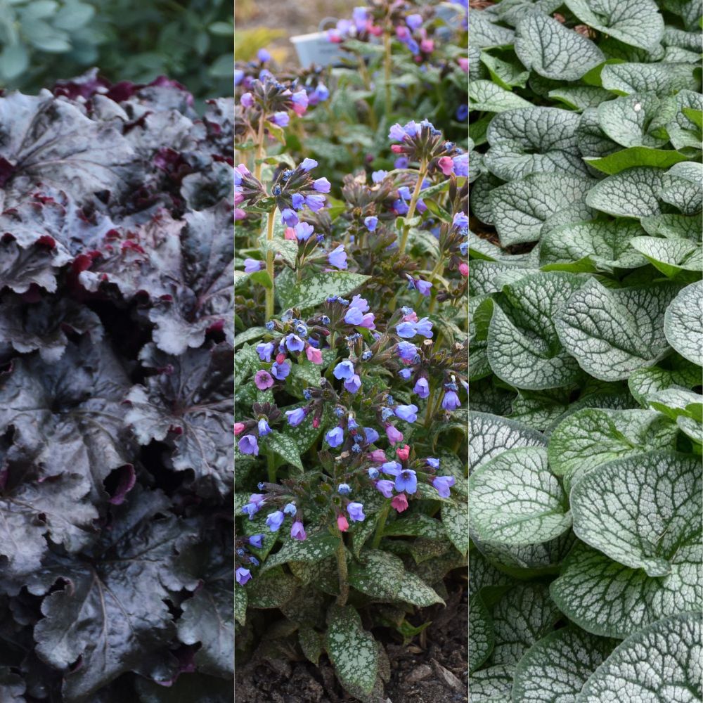 Use this foliage centric shade recipe to keep your garden glamorous and the deer at bay. Begin with the silver speckled foliage of Pink-a-Blue Pulmonaria and Jack of Diamonds Brunnera; these are early flowering perennials that will wake up early in spring and give you immediate returns. After the flowers fade, the leaves will hold interest through summer and into fall. DRESSED UP® Heuchera will add constant foliage color from spring through autumn (and later as they are semi-evergreen). Tall scapes of flowers appear in summer for added interest.