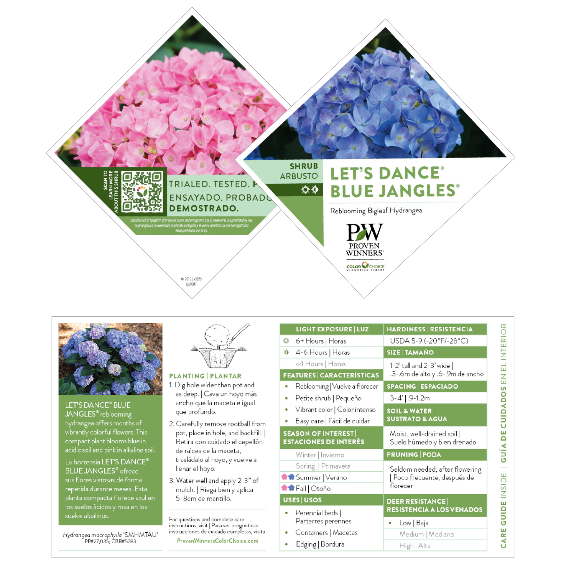 Bring endless color to your garden with Let's Dance® Blue Jangles® Hydrangea. Known for blooming on both old and new wood, this hydrangea guarantees an abundant display of flowers every season. Its compact size is perfect for smaller spaces, while its vibrant flower heads offer deep blue hues in acidic soils and bright pink shades in alkaline soils. With its tight habit and continuous blooming, Let’s Dance® Blue Jangles® provides a reliable and colorful addition to any landscape or container garden.