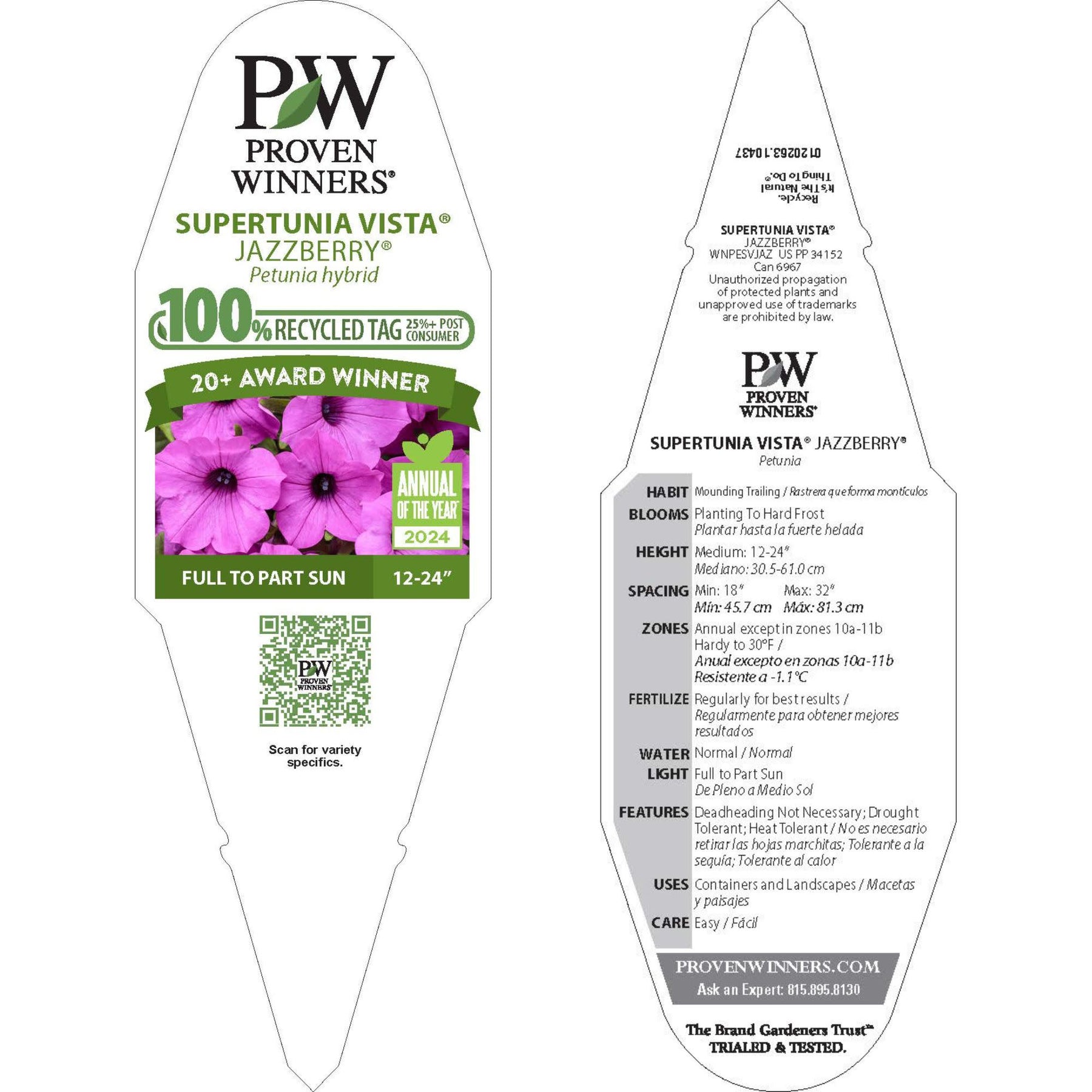 Destined to become a garden favorite, Supertunia Vista® Jazzberry dazzles with its vibrant magenta-purple flowers that bloom all season long, creating a continuous burst of color. With its upright mounding habit, this variety is perfect for filling landscape beds and large containers, adding a vibrant touch wherever it’s planted. It’s a magnet for butterflies and hummingbirds and is both heat and drought tolerant, making it a resilient and easy-care option for any garden. Supertunia Vista® Jazzberry has earned tons of prestigious awards, including Top Performer and Perfect Score, cementing its place as a standout beauty in any outdoor space!