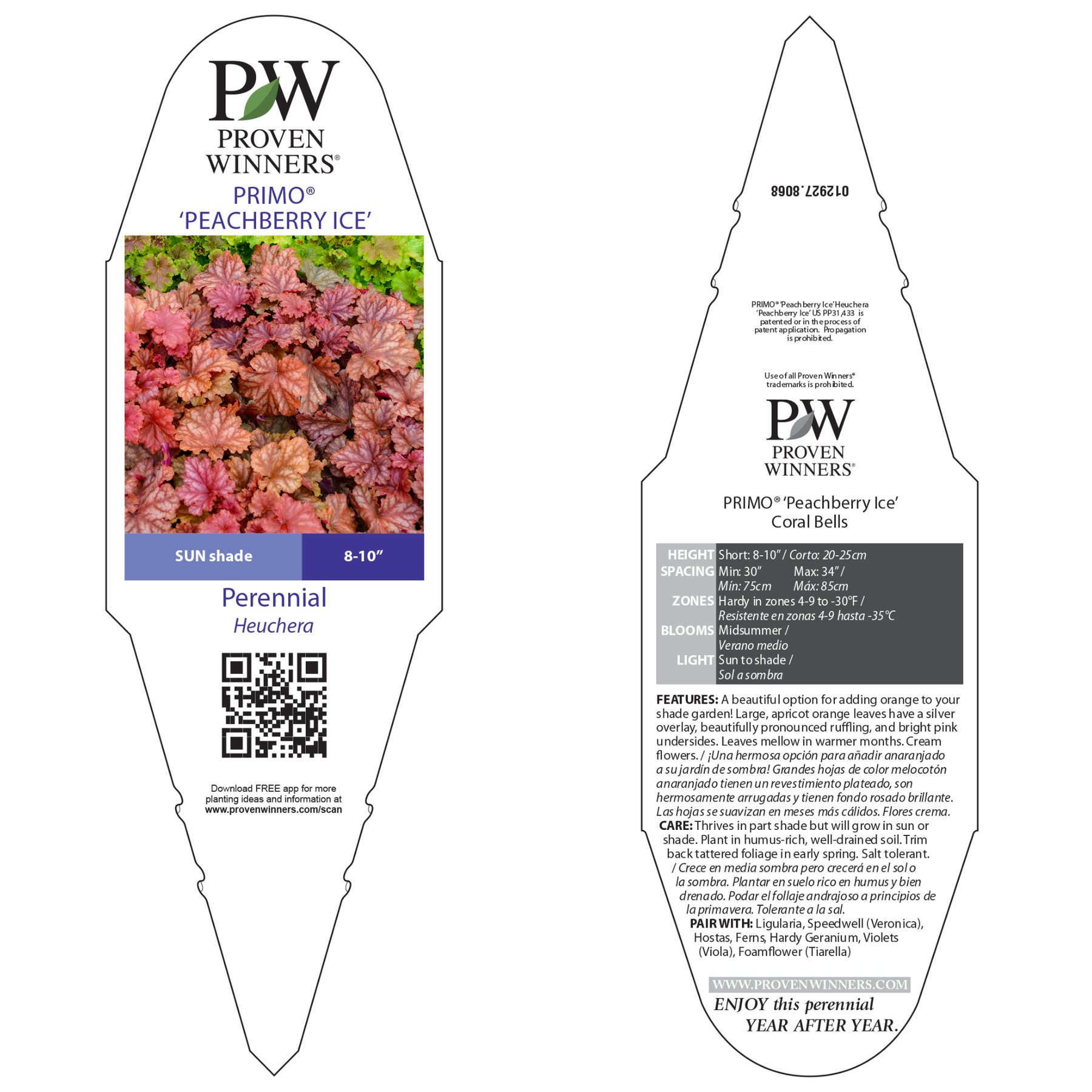 Primo® 'Peachberry Ice' has large, apricot orange leaves with a silver overlay, beautifully pronounced ruffling, and bright pink undersides. Leaves mellow in warmer months and cream flowers bloom in mid summer. This perennial resists deer and attracts butterflies and hummingbirds.