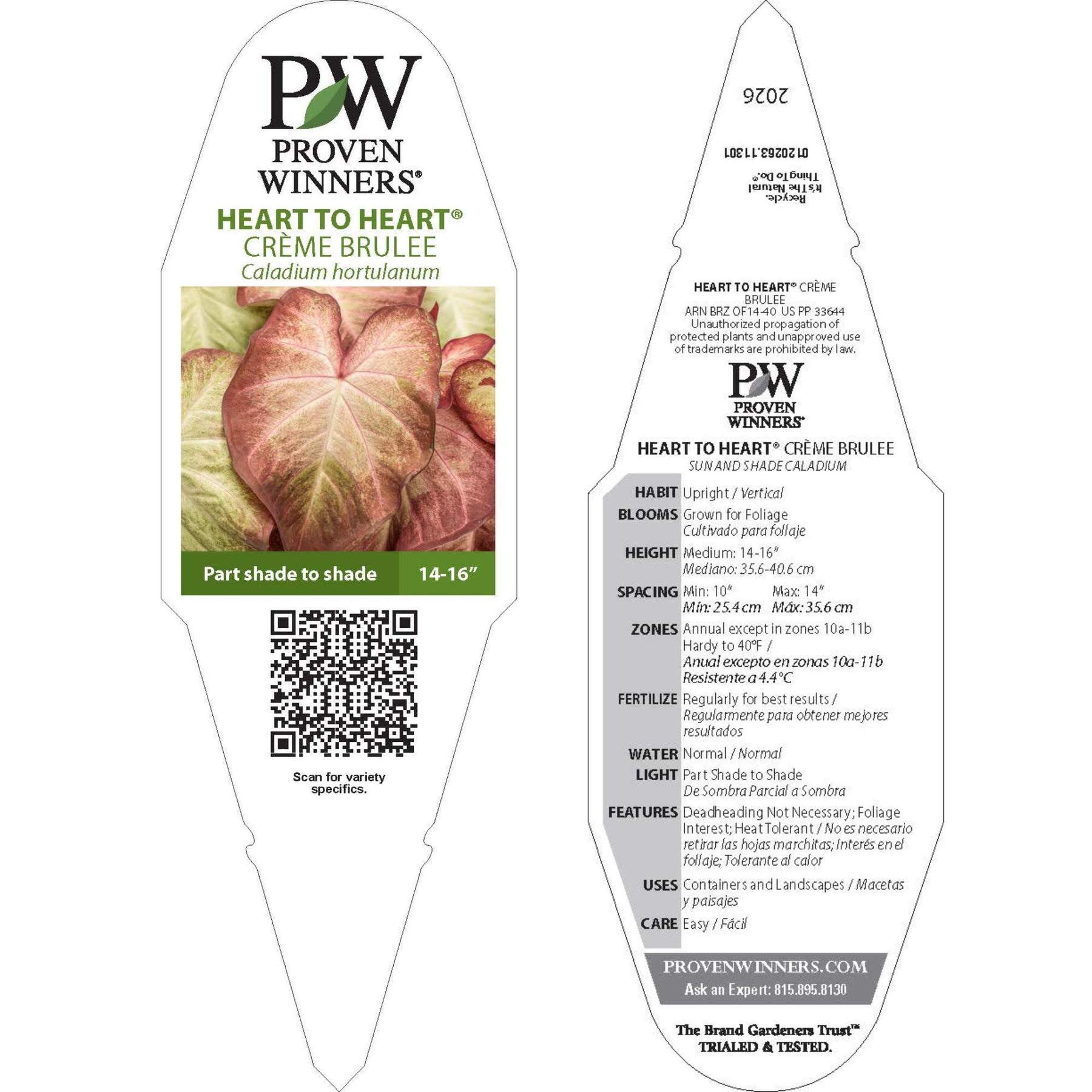 Elevate your garden design with the graceful charm of Heart to Heart® Crème Brulee. This distinctive caladium stands out with generously sized, heart-shaped leaves brushed in creamy white, each bordered by a soft, pink-bronze margin that subtly blends into the center. Elegant white veining completes the look, lending a refined, painterly quality to every leaf.