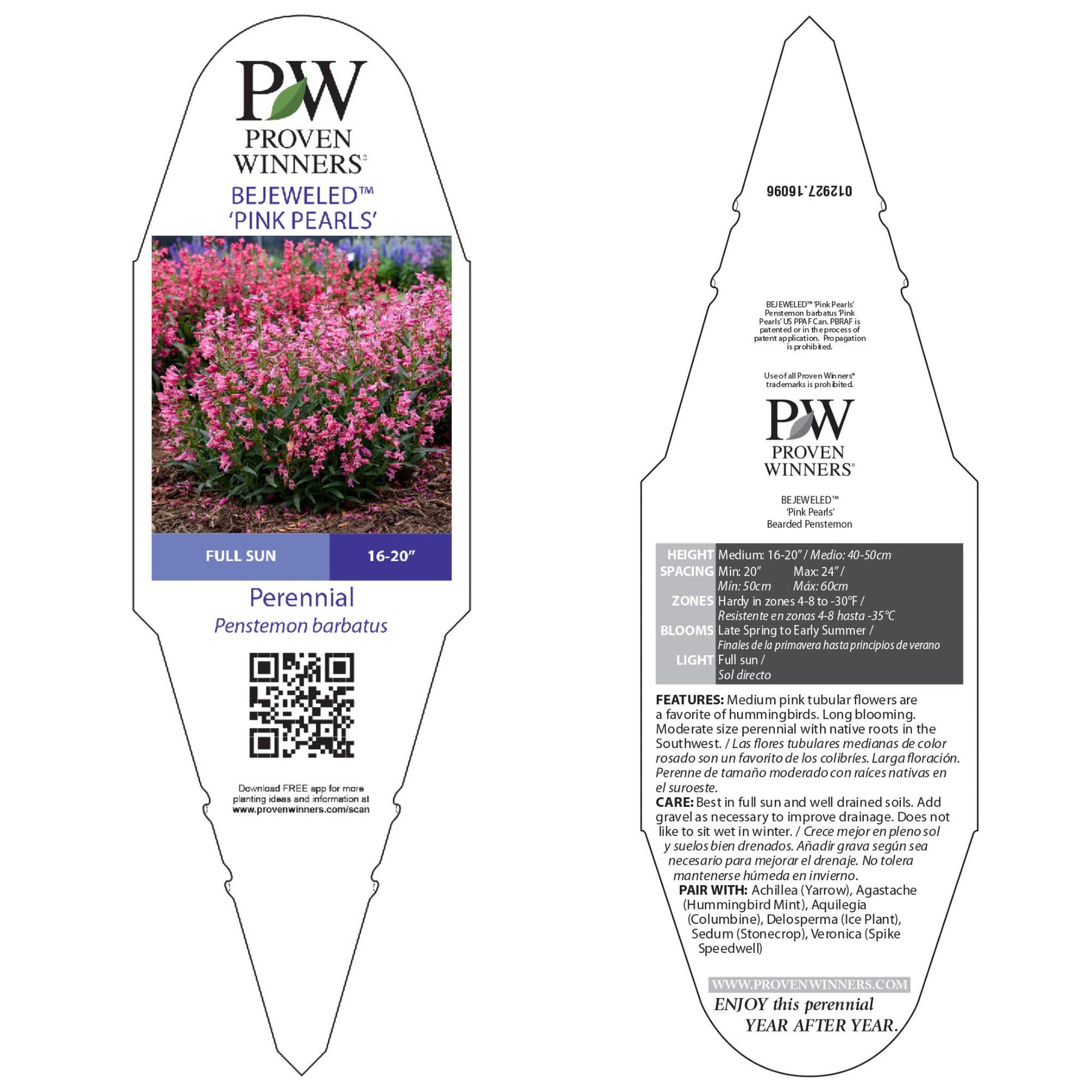 Add a touch of sparkle to your garden with Bejeweled® 'Pink Pearls' Penstemon, a vibrant showstopper that shines throughout the season. This midsize variety is prized for its dense growth habit and large, striking flowers, with strong stems holding the bright, medium pink tubular blooms upright for a full, lush look. The lance-shaped, dark blue-green foliage provides a stunning backdrop that remains attractive all season long. Appearing in late spring and early summer, the cheerful flowers not only bring color to your garden but also attract hummingbirds, making Bejeweled® 'Pink Pearls' a delightful addition. With its drought tolerance and easy-care nature, this perennial is as low-maintenance as it is beautiful.