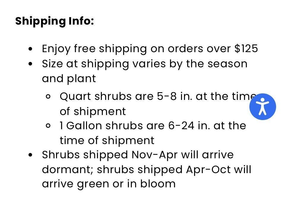 I ordered three varieties of the 'Chiffon' Rose of Sharon shrubs. Two were really nice sized (Blue & Dark Lavender), but the Magenta version was very small in comparison that it looked like it shuld have been a quart instead of a gallon. In addition, when planting them we noticed the small Magenta one barely had any root system in the nursery pot (all the soil just crumbled apart to reveal a little root ball with tiny roots). The two larger plants appeared to have more well-formed roots. A bit worried that the little Magenta won't make it in the August heat in Kansas.