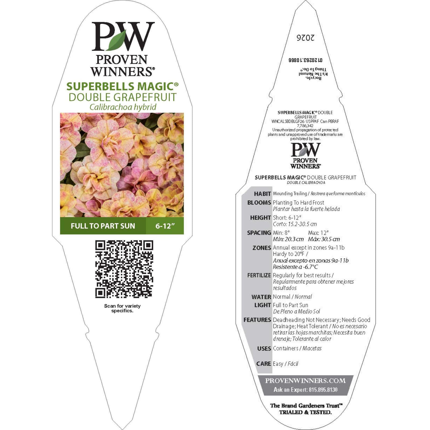 Double the blooms, double the charm! Superbells Magic® Double Grapefruit brings everything you adored in Superbells Magic® Pink Lemonade—now with lush, fully double flowers. These vibrant calibrachoas open in a cheerful lemon yellow and gracefully transition to soft pink as the season warms, creating a mesmerizing ombré effect that shifts with the sunlight.