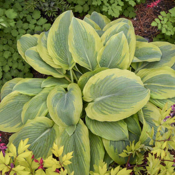 Take a chance on the stunning Chance Encounter Hosta! This exciting new variety features heart-shaped powdery blue leaves with a wide, eye-catching gold margin. As the season progresses, the apple-green edges of the leaves transition to a rich gold, creating a beautiful, ever-changing display. While Chance Encounter stands modestly at 12-16" tall, its impressive width—reaching over 3' across—makes it a bold addition to any garden. Perfect as a specimen plant along the front of a shady border, it also treats you to delicate white flowers in early summer. This hosta is sure to be a showstopper!