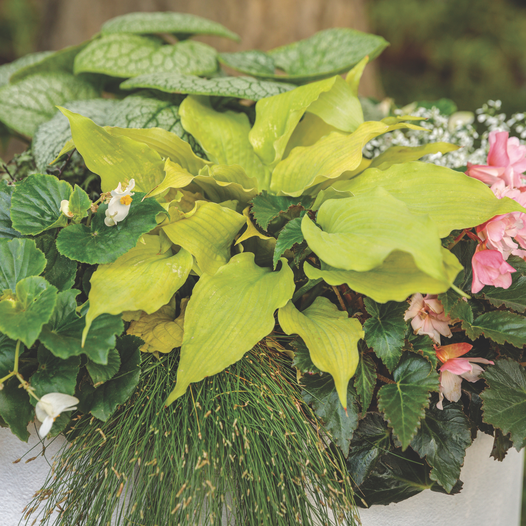 Brighten your garden with the vibrant, golden hue of Shadowland® 'Echo the Sun', a striking hosta variety known for its unique, sun-catching color and textured appeal. This exceptional hosta features thick, wedge-shaped leaves with beautifully rippled, yellow margins that provide a bold contrast to the more traditional green foliage. Its low mounded growth habit makes it an ideal choice for borders, ground covers, or as a standout feature in shaded garden areas. In mid-summer, delicate lavender flowers emerge on slender scapes, adding a touch of elegance and attracting hummingbirds with their sweet nectar. Easy to grow and incredibly hardy, 'Echo the Sun' thrives in partial to full shade and requires minimal maintenance while delivering visual interest with its dynamic color and texture. Perfect for bringing a burst of sunshine to shaded spots in your landscape, this hosta is a must-have for gardeners looking to add both beauty and functionality to their outdoor space.