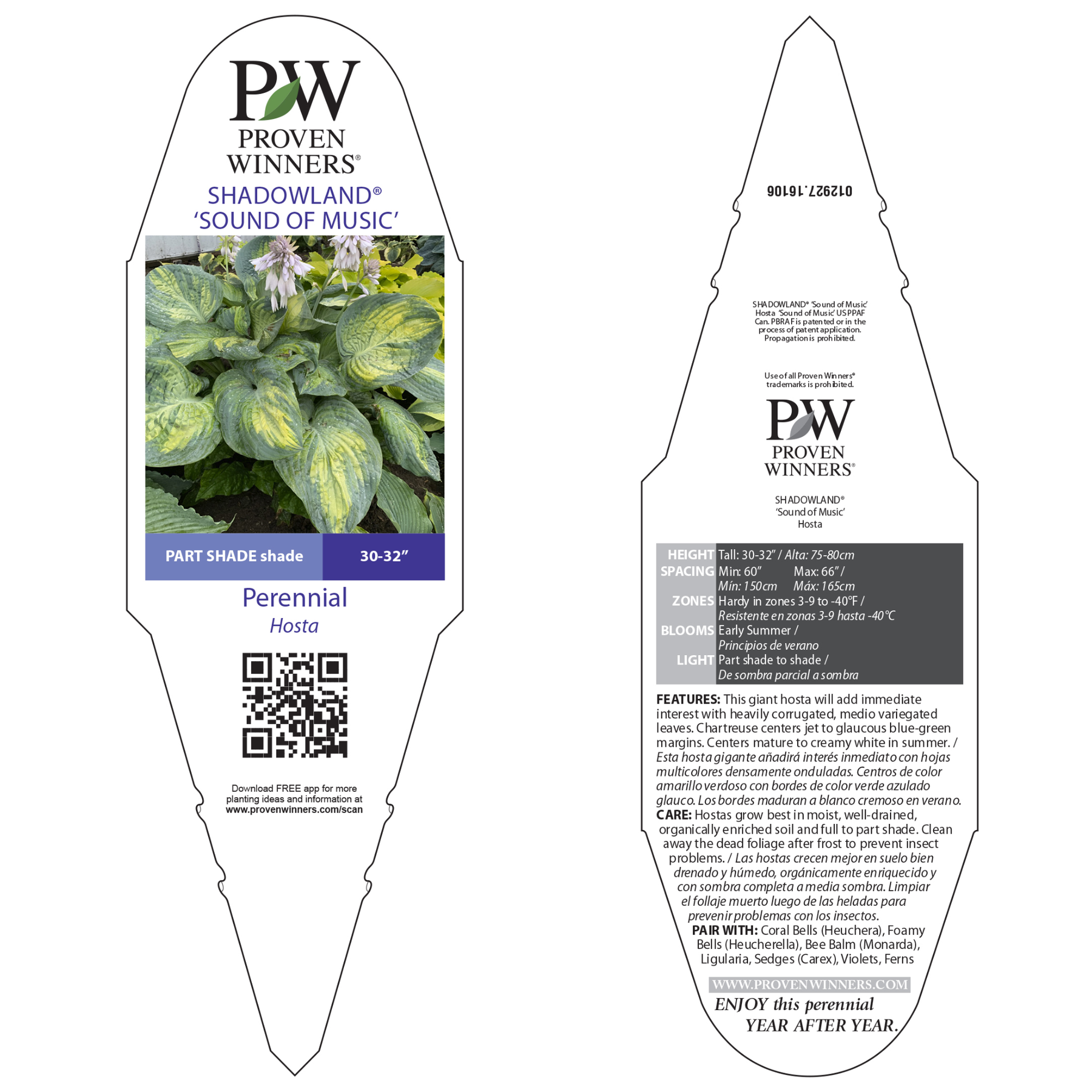 Bring your garden to life with the Sound of Music Hosta, a true showstopper that commands attention. This giant variety boasts beautifully corrugated, medio variegated leaves that start with vibrant chartreuse centers, gradually transitioning to creamy white as summer unfolds, all framed by striking blue-green margins. The dramatic foliage creates a lush, textured backdrop that adds instant visual interest to any shade garden. As mid summer arrives, large clusters of near-white flowers emerge, filling the air with a soft melody that attracts birds and pollinators alike. With its bold presence and vibrant seasonal changes, Sound of Music is sure to be the star of your garden.