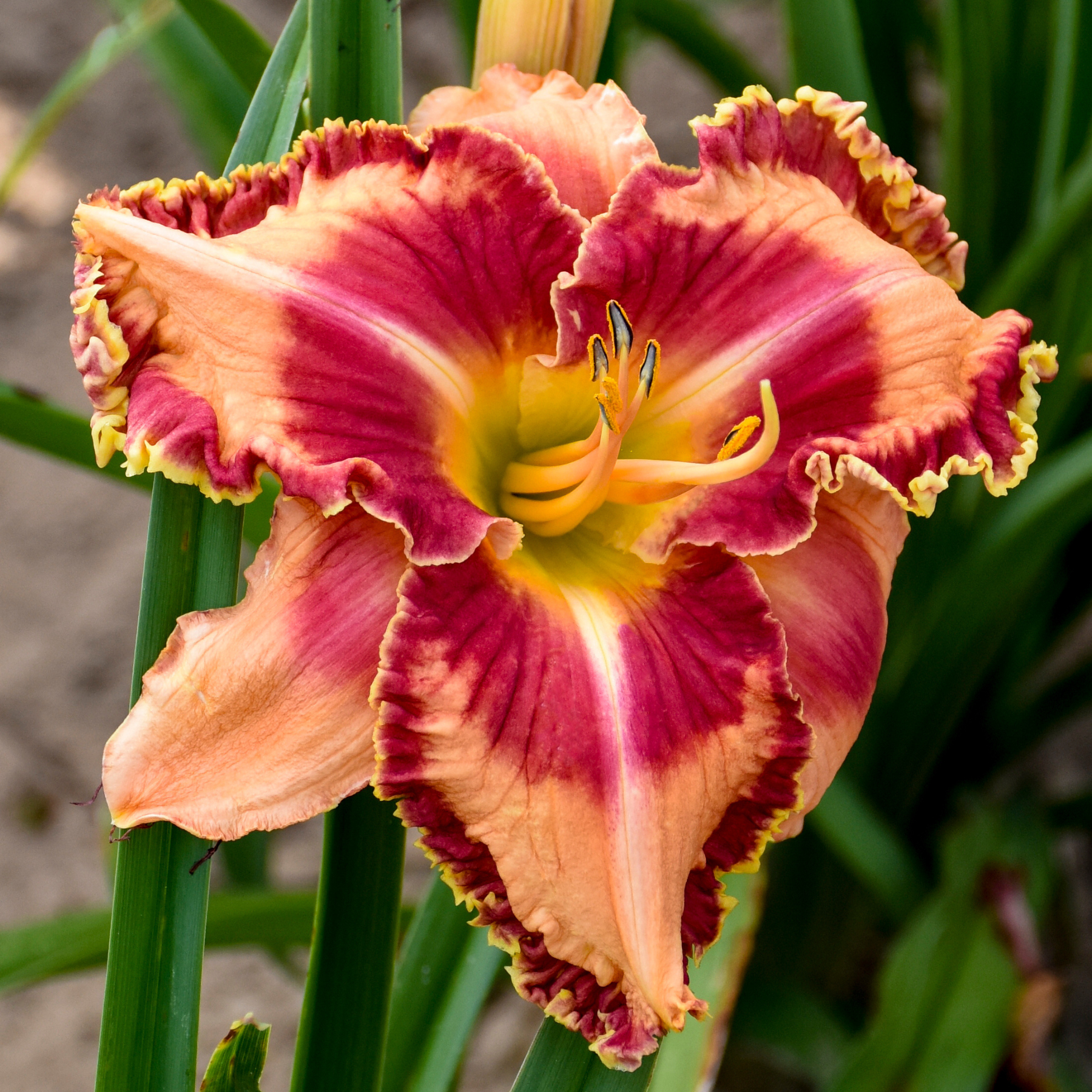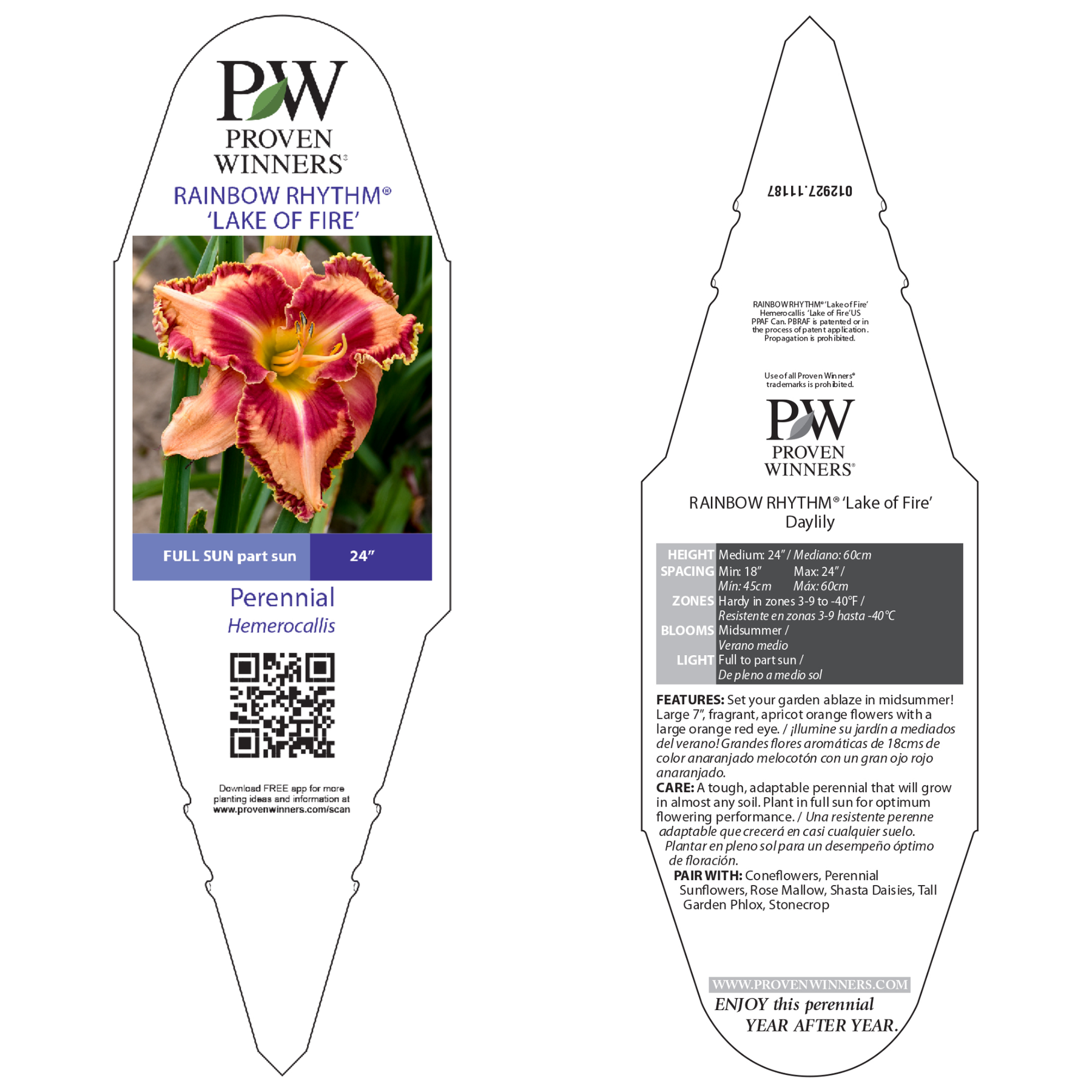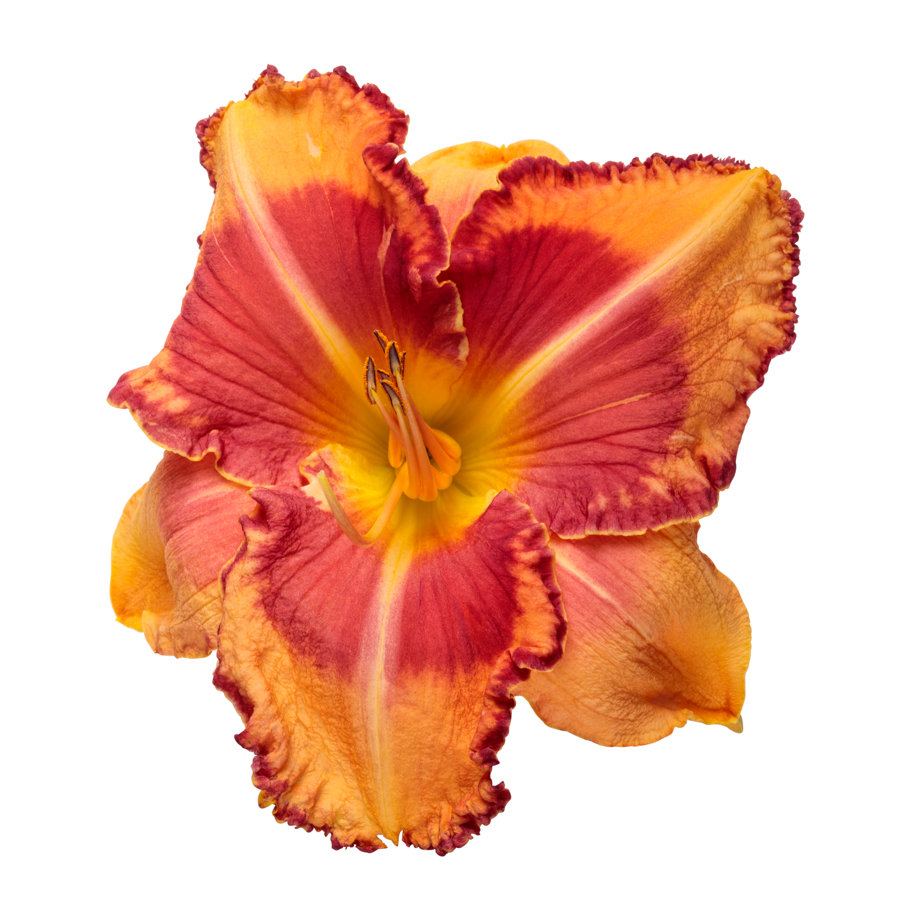 Rainbow Rhythm® 'Lake of Fire' Daylily is a breathtaking addition to any garden, showcasing a stunning blend of reds, oranges, and yellows in its large, 7-inch blooms. The apricot-orange petals are highlighted by a bold, wide orange-red eye, drawing the eye in with its striking contrast. Along the ruffled edge is a matching orange red picotee edge with a razor thin golden yellow margin. ‘Lake of Fire’ is a great addition to any garden with its fiery colors, creating a captivating display of vibrant beauty.