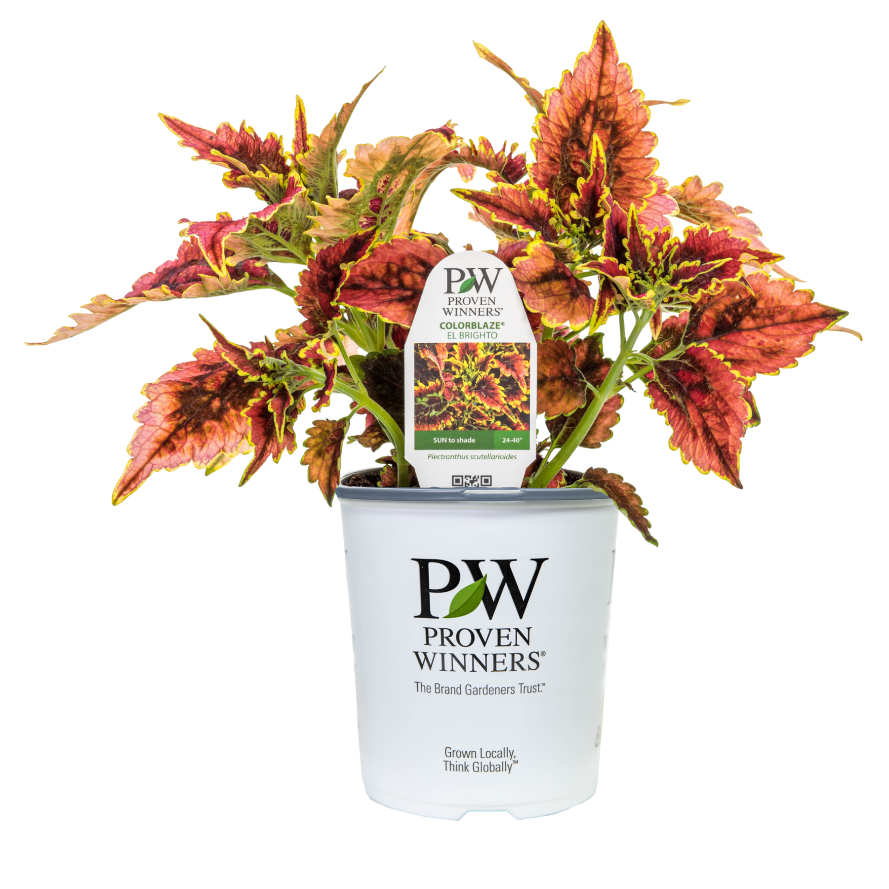 ColorBlaze® El Brighto Coleus foliage displays a spectacular, fiery show of luxurious purple and red centers with yellow margins. It is a highly saturated and impressive plant that is heat tolerant and adaptable as a houseplant when placed in a bright area. Deadheading is not necessary, making it an easy-to-care-for plant to add to containers as a thriller or your landscape to brighten up a shady corner.