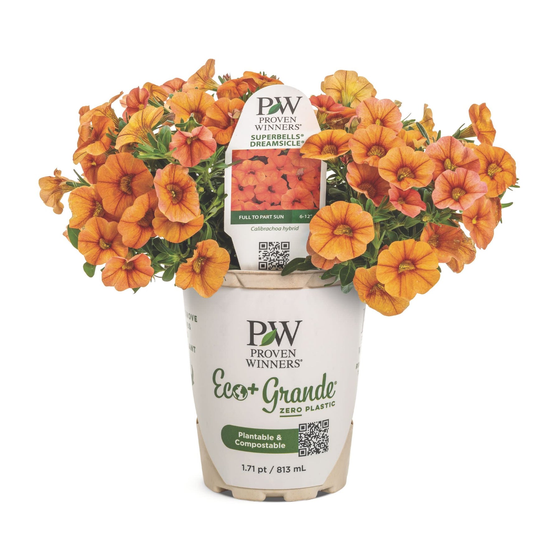 Superbells Dreamsicle displays beautiful orange flowers. Abundant, small petunia-like flowers bloom from planting until the first frost, attract hummingbirds, and do not require deadheading.