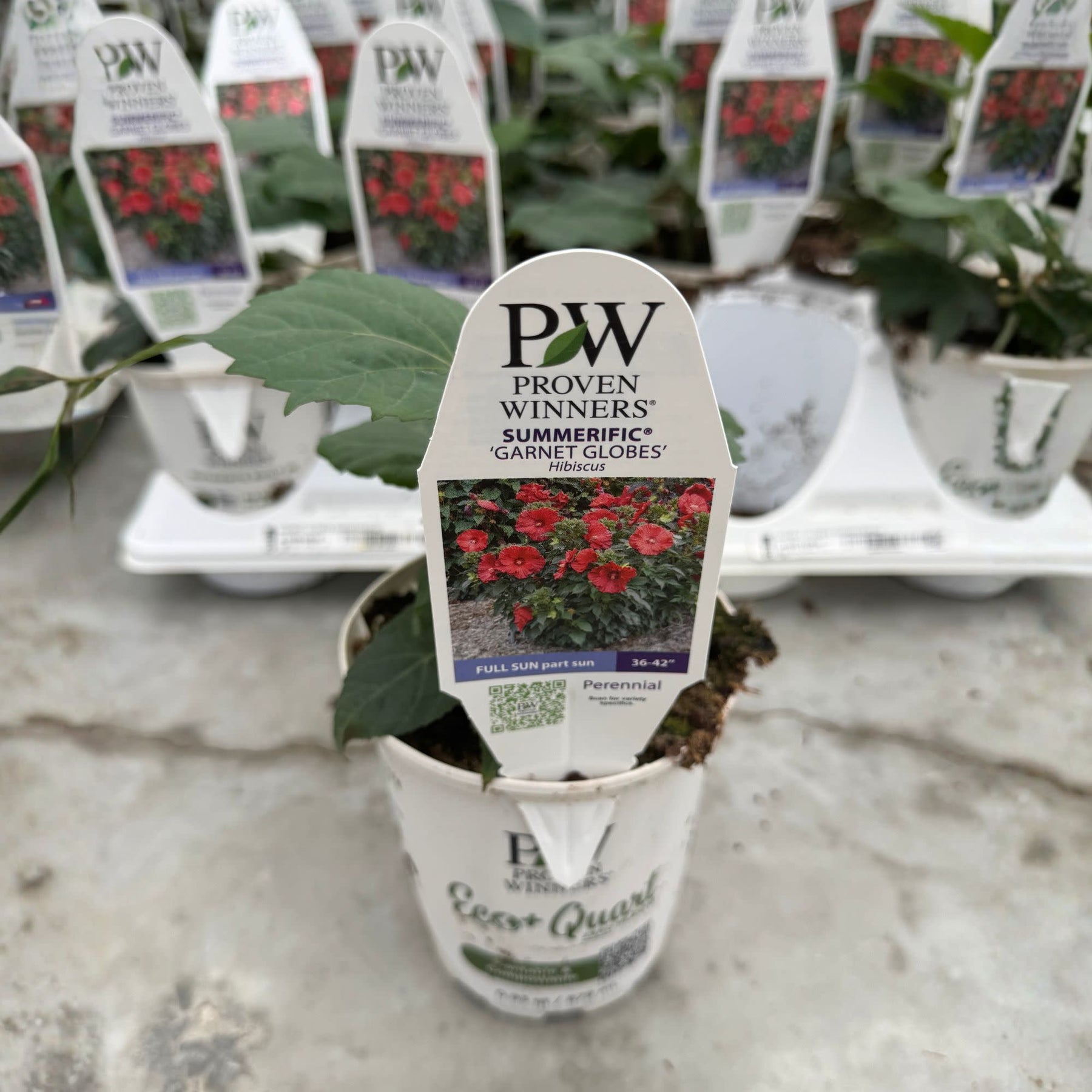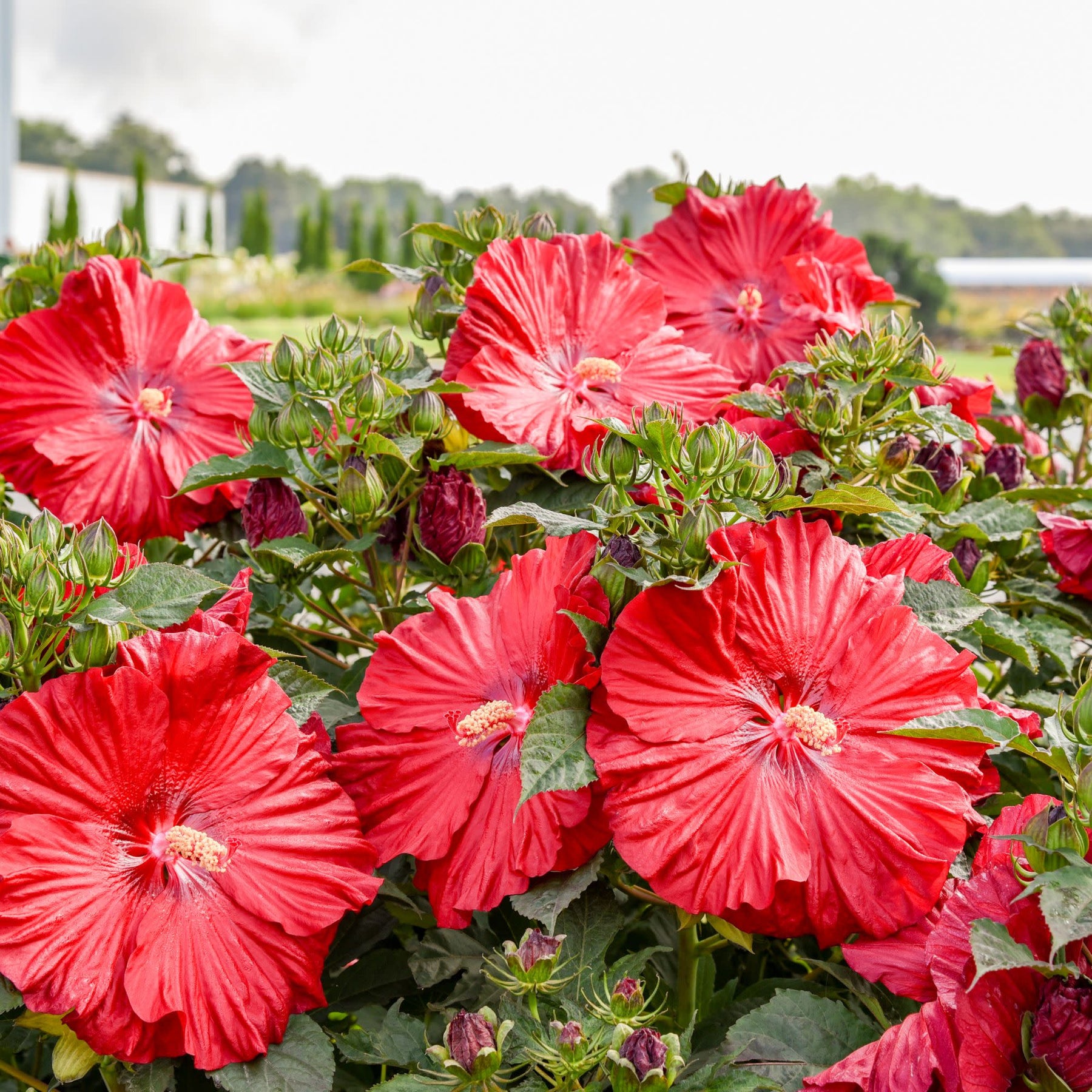 Compact, bold, and bursting with color, Summerific® 'Garnet Globes' is a standout hibiscus that forms a tidy 3' tall and wide sphere—perfect for adding structure and drama to your garden. Starting in midsummer, it puts on a spectacular show with massive 7" dark garnet red blooms, each with a deep, dark eye. The flowers cover the entire plant, stem to tip, making it look like it's wearing a gown of blossoms.