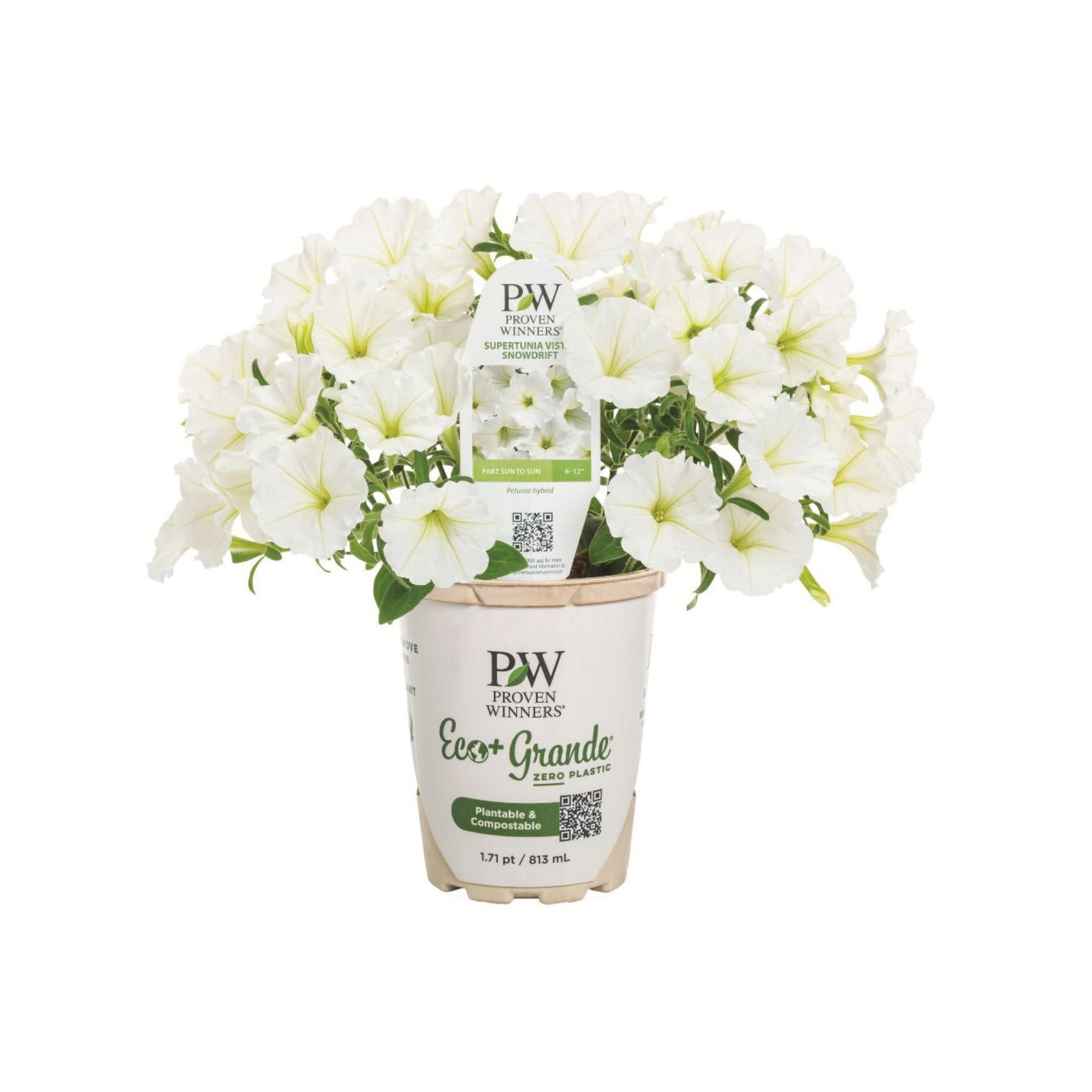Supertunia Vista® Snowdrift™ features stunning, pure white flowers that bloom from spring to frost, providing continuous color throughout the season. With its vigorous growth and mounding, trailing habit, this petunia is an ideal choice for both landscape beds and large containers. It works beautifully in the front or middle of garden beds and functions as both a filler and spiller in containers, creating a lush, cascading display. Attracting pollinators and requiring no deadheading, Supertunia Vista® Snowdrift™ is a low-maintenance beauty that brings effortless elegance to your outdoor space.