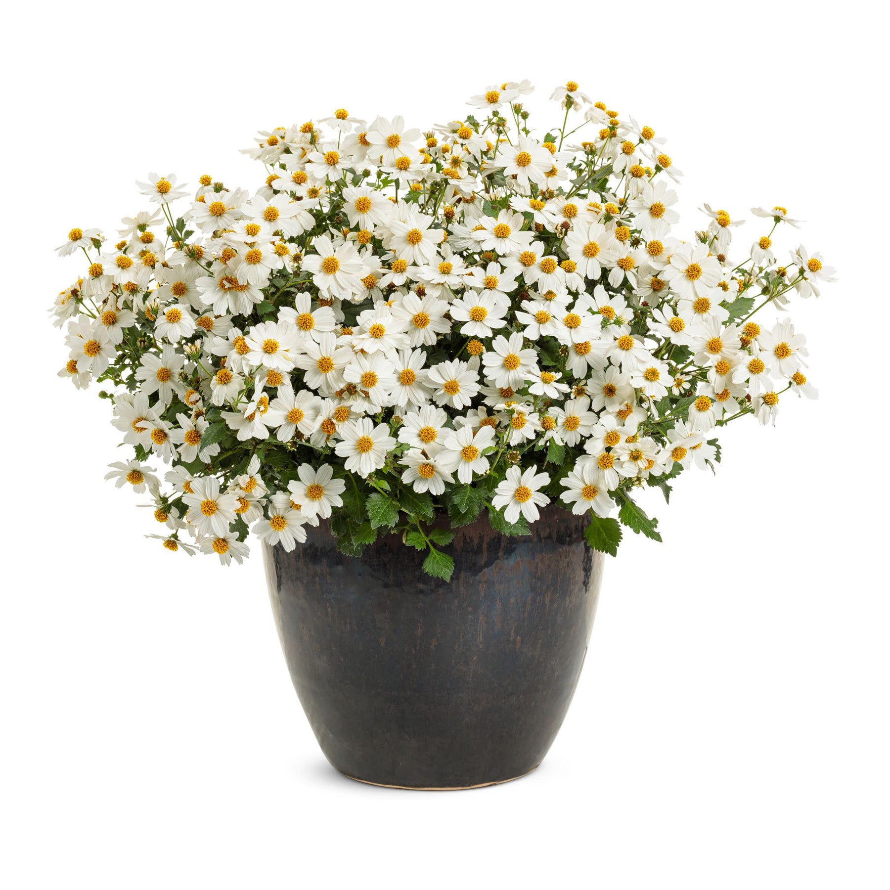 Elevate your garden with the pure elegance of Campfire® Marshmallow™ Bidens. Known for its vigor and heat tolerance, this beautiful variety thrives even in hot and dry conditions, making it a low-maintenance yet stunning addition to any garden. The large, pure white flowers gracefully surround a striking golden yellow center, creating a crisp contrast that catches the eye.