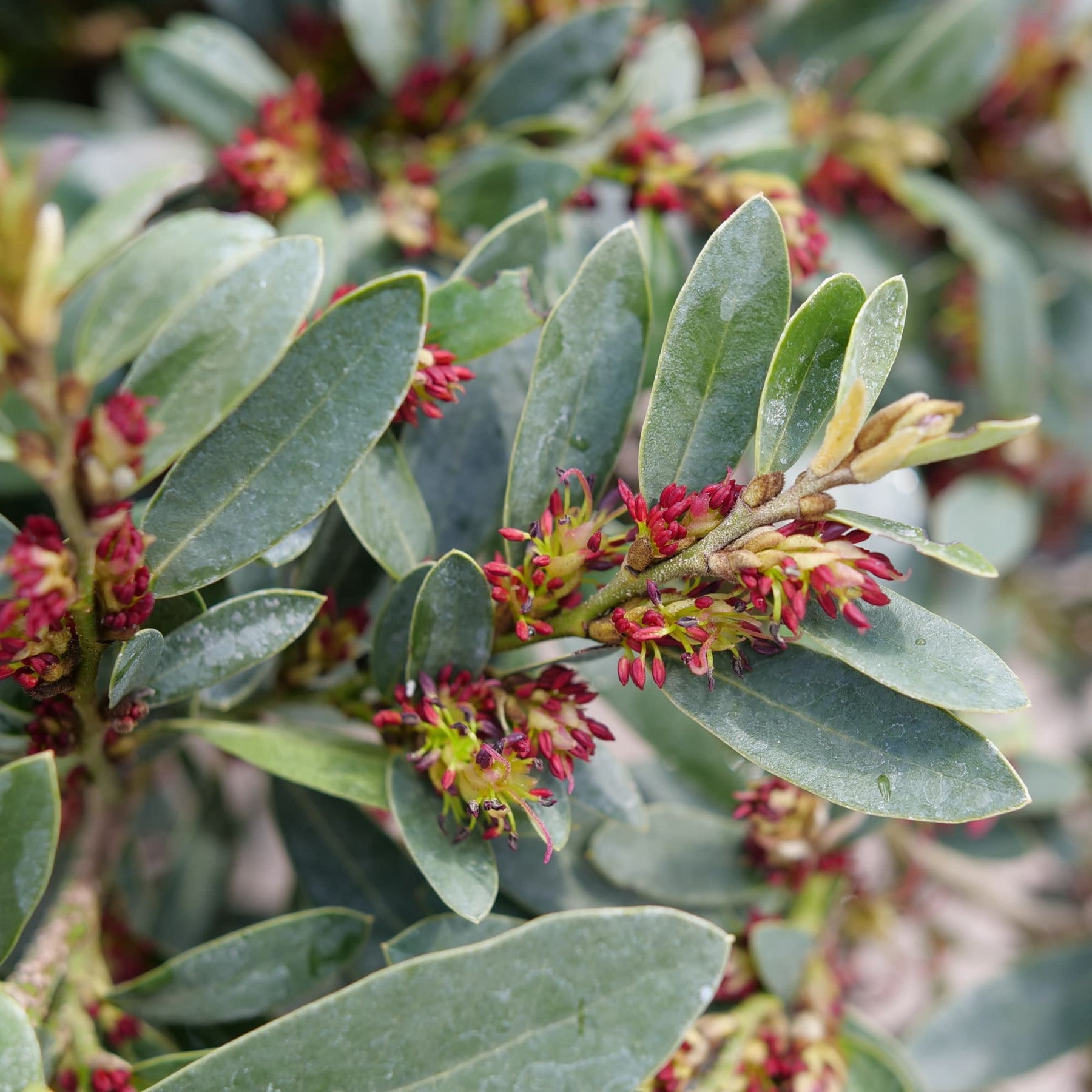 Its broad, leathery foliage delivers bold texture and dynamic color year-round. Bronze-toned new growth matures to a sophisticated blue-green, creating depth and contrast in any planting. Just when you think it’s done impressing, Buckhead™ Bold surprises with vibrant red flowers in late winter—an unexpected burst of cheer when the garden needs it most.