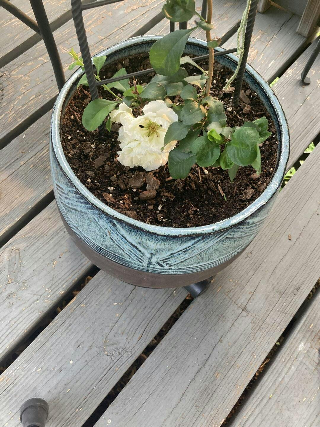 I’m so happy with my quince! I already have 3 blooms near the bottom and they resemble a rose. A beautiful white…it’s very healthy and thriving. I put it in a pot until I can transplant it in the fall.
