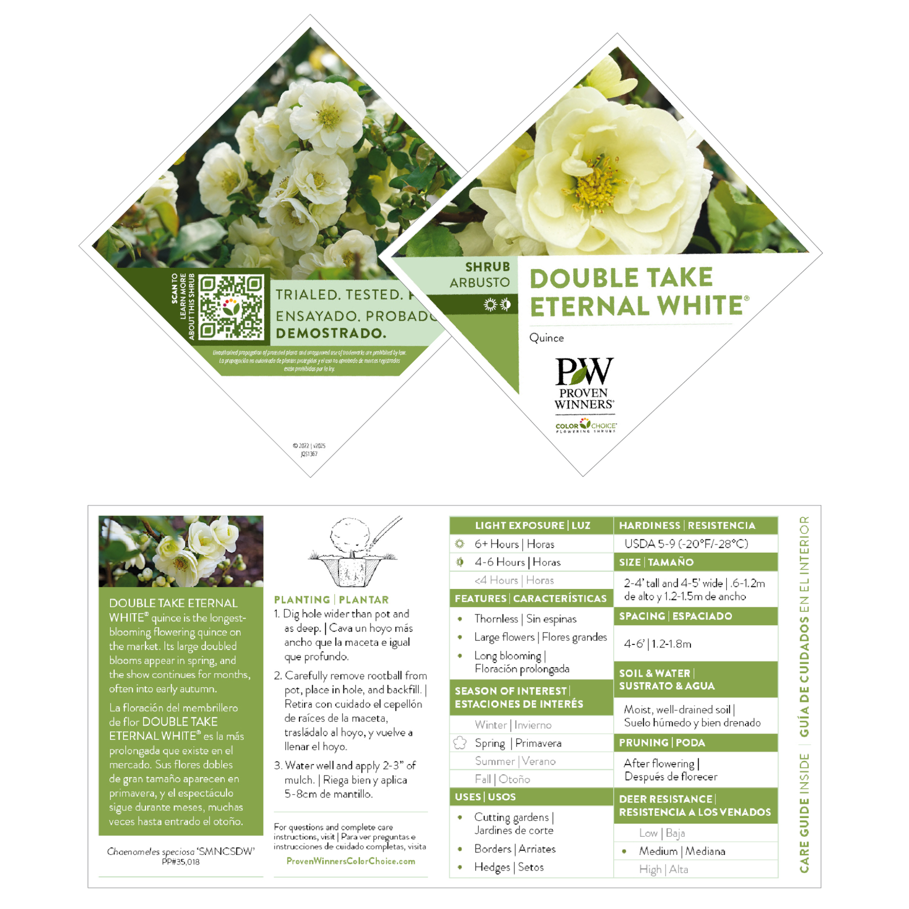 Bloom all season with Double Take Eternal White® Quince! This super long bloomer boasts creamy white flowers and abundant buds, lasting from mid-spring to early summer. Its unique wider-than-tall shape makes for a beautiful display. Say goodbye to short-blooming quince and hello to weeks of gorgeous blooms!