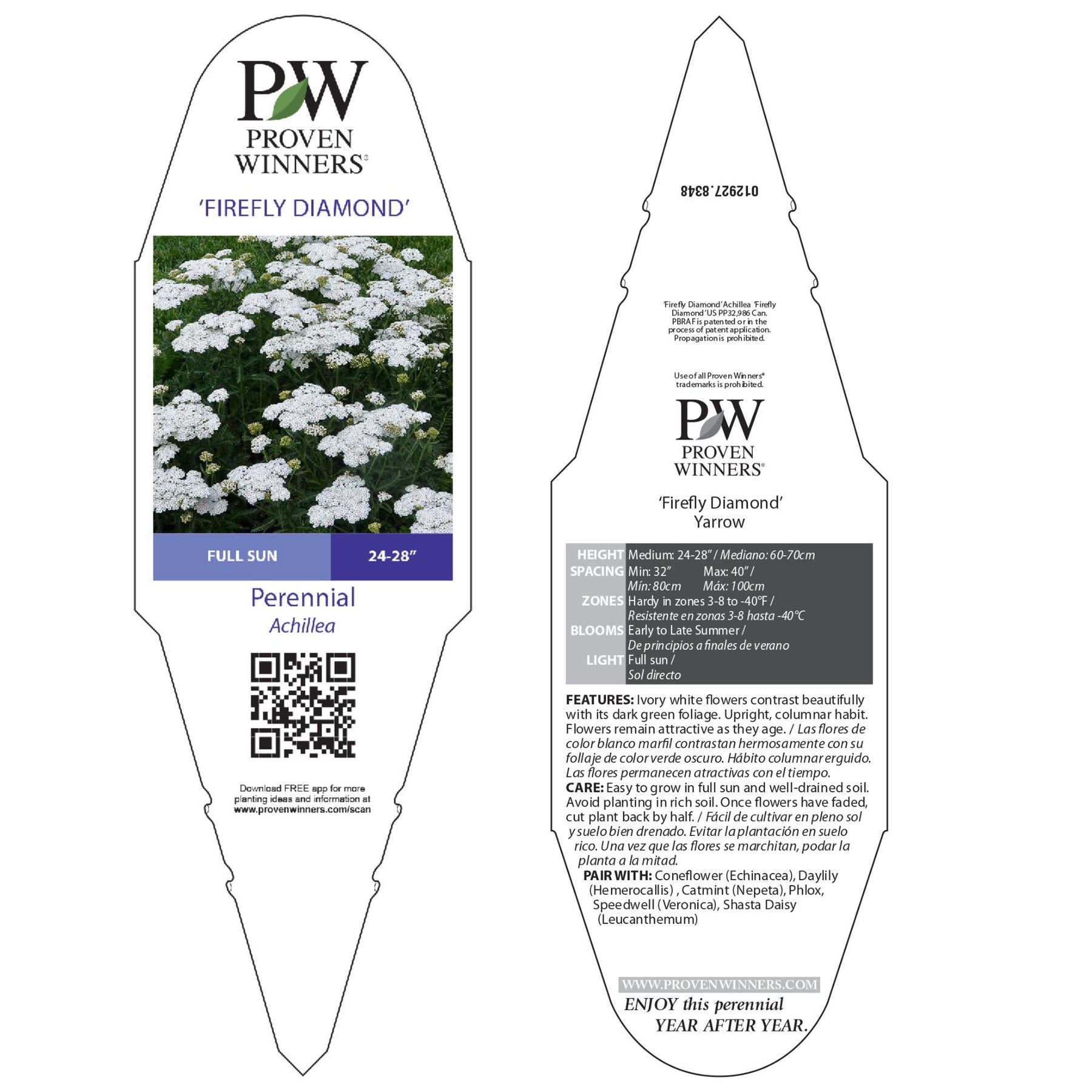 ‘Firefly Diamond’ Yarrow is a beautiful and versatile perennial that enchants with its delicate ivory-white flowers, blooming continuously throughout the summer. Its dark green foliage provides a stunning backdrop, creating a striking contrast to the blooms. Known for being easy to grow, this hardy plant thrives with minimal effort, while its fragrant flowers add a lovely scent to any garden. Perfect for borders, landscapes, or as a vibrant addition to cut and dried flower arrangements, ‘Firefly Diamond’ is an excellent choice for both seasoned gardeners and beginners alike.