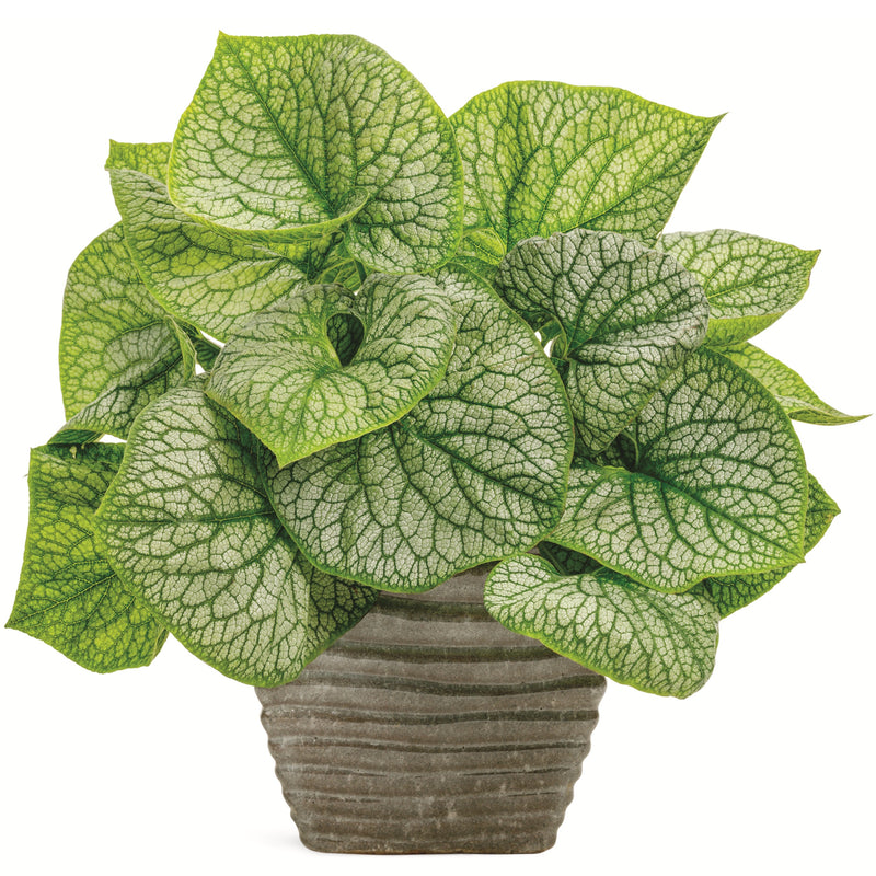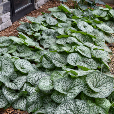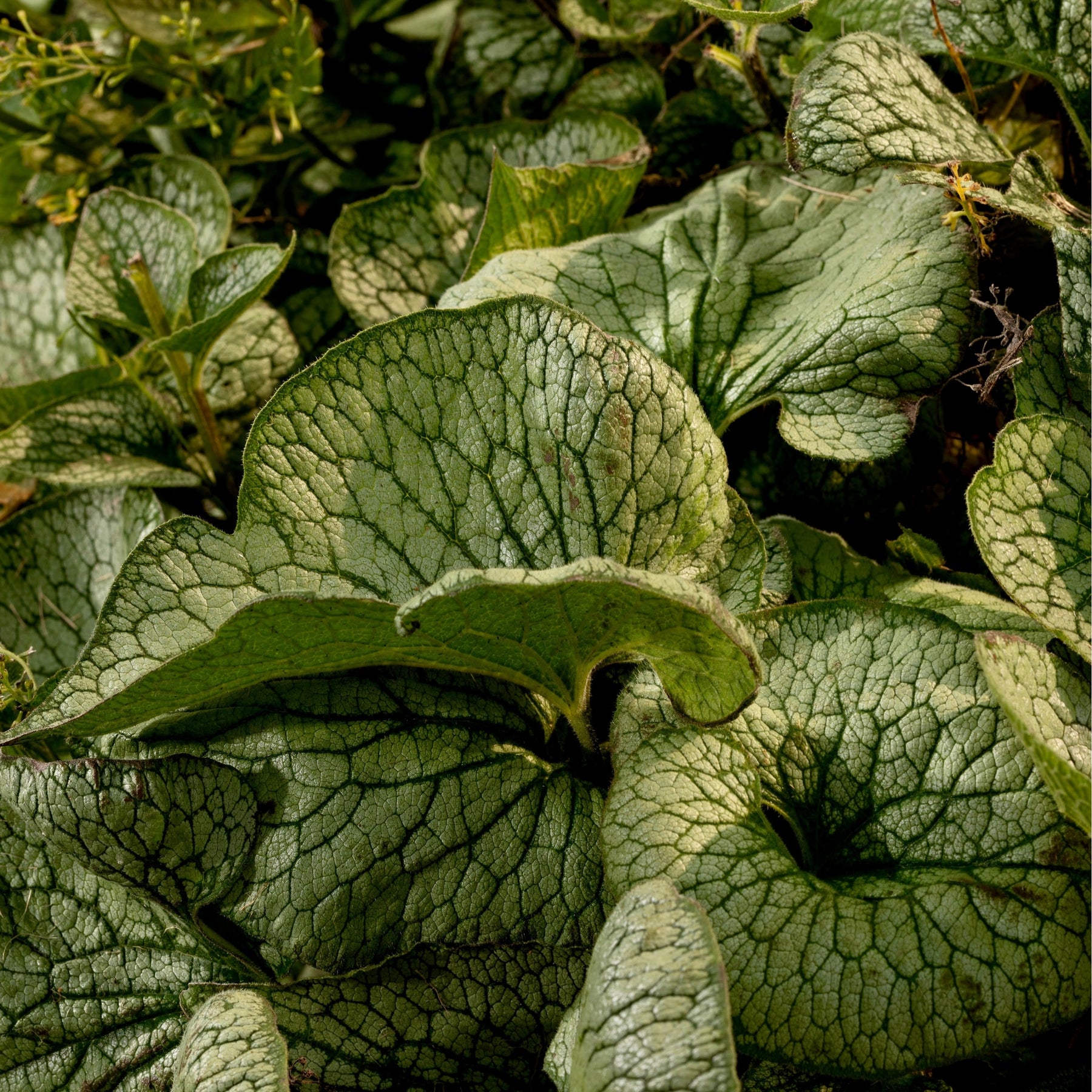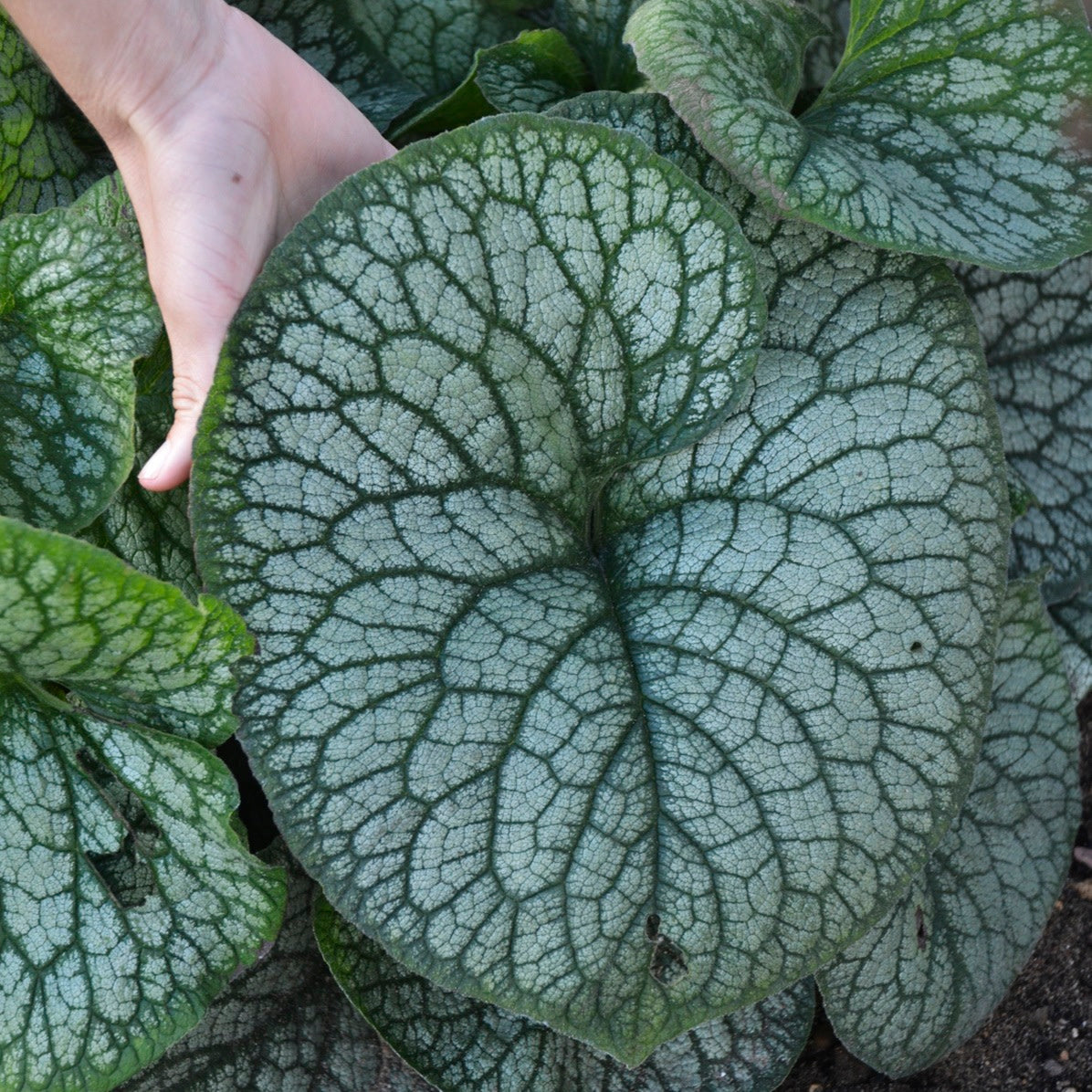 Introducing 'Jack of Diamonds,' a showstopper that adds striking beauty to any garden or container! With 9-10" leaves featuring a silver overlay and dark green veining, this plant’s dramatic, overlapping foliage forms circular shapes from afar, creating a stunning visual effect. In mid to late spring, delicate baby blue blossoms—reminiscent of forget-me-nots—emerge, adding a soft touch of color. The mounded habit makes 'Jack of Diamonds' a perfect filler and spiller for containers, while also thriving in the landscape. It’s a true gem that combines beauty, texture, and versatility!