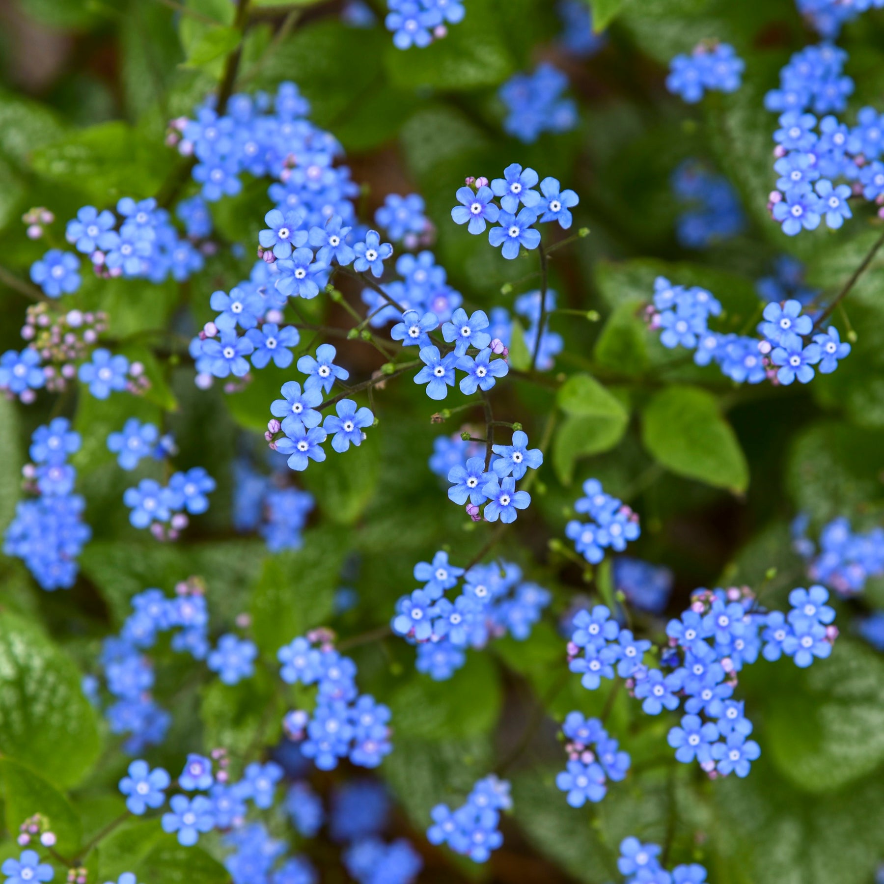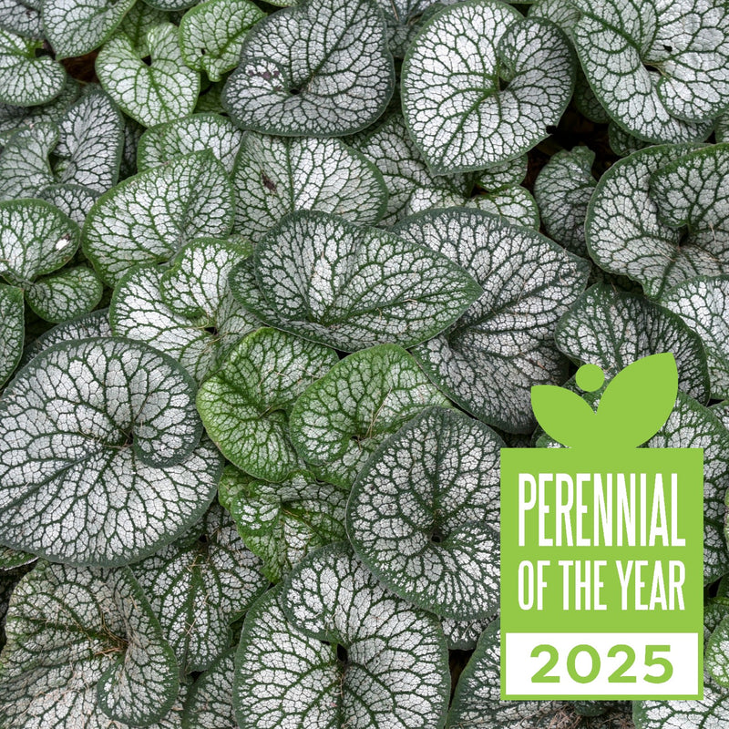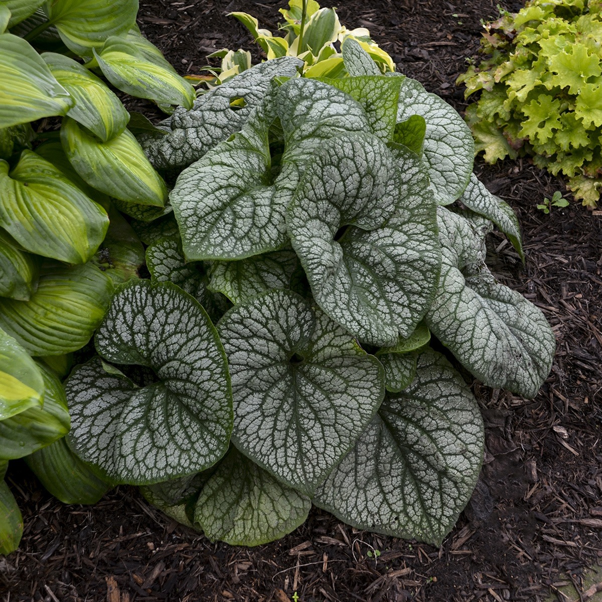 Introducing 'Jack of Diamonds,' a showstopper that adds striking beauty to any garden or container! With 9-10" leaves featuring a silver overlay and dark green veining, this plant’s dramatic, overlapping foliage forms circular shapes from afar, creating a stunning visual effect. In mid to late spring, delicate baby blue blossoms—reminiscent of forget-me-nots—emerge, adding a soft touch of color. The mounded habit makes 'Jack of Diamonds' a perfect filler and spiller for containers, while also thriving in the landscape. It’s a true gem that combines beauty, texture, and versatility!