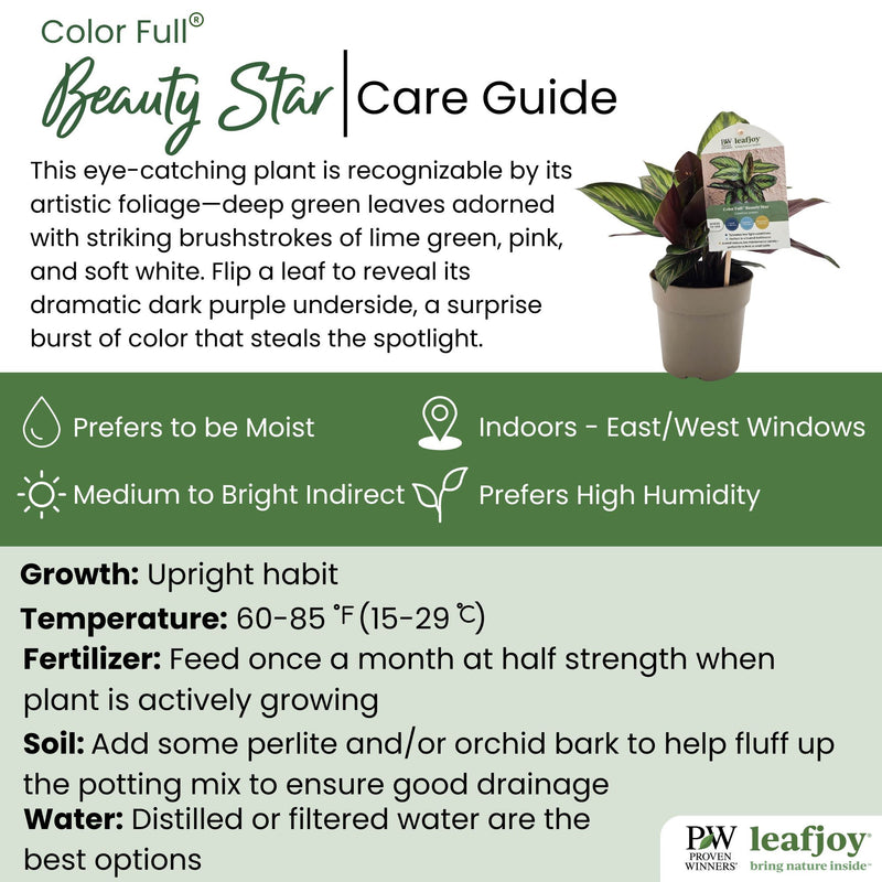 Bring bold tropical flair to your space with the stunning Color Full® Beauty Star Pinstripe Calathea. This eye-catching plant is instantly recognizable by its artistic foliage—deep green leaves adorned with striking brushstrokes of lime green, pink, and soft white. Flip a leaf to reveal its dramatic dark purple underside, a surprise burst of color that steals the spotlight as the leaves gently curl each evening in response to the light. A true living work of art, this Calathea thrives in bright, indirect light and adds vibrant energy to any room or plant collection.