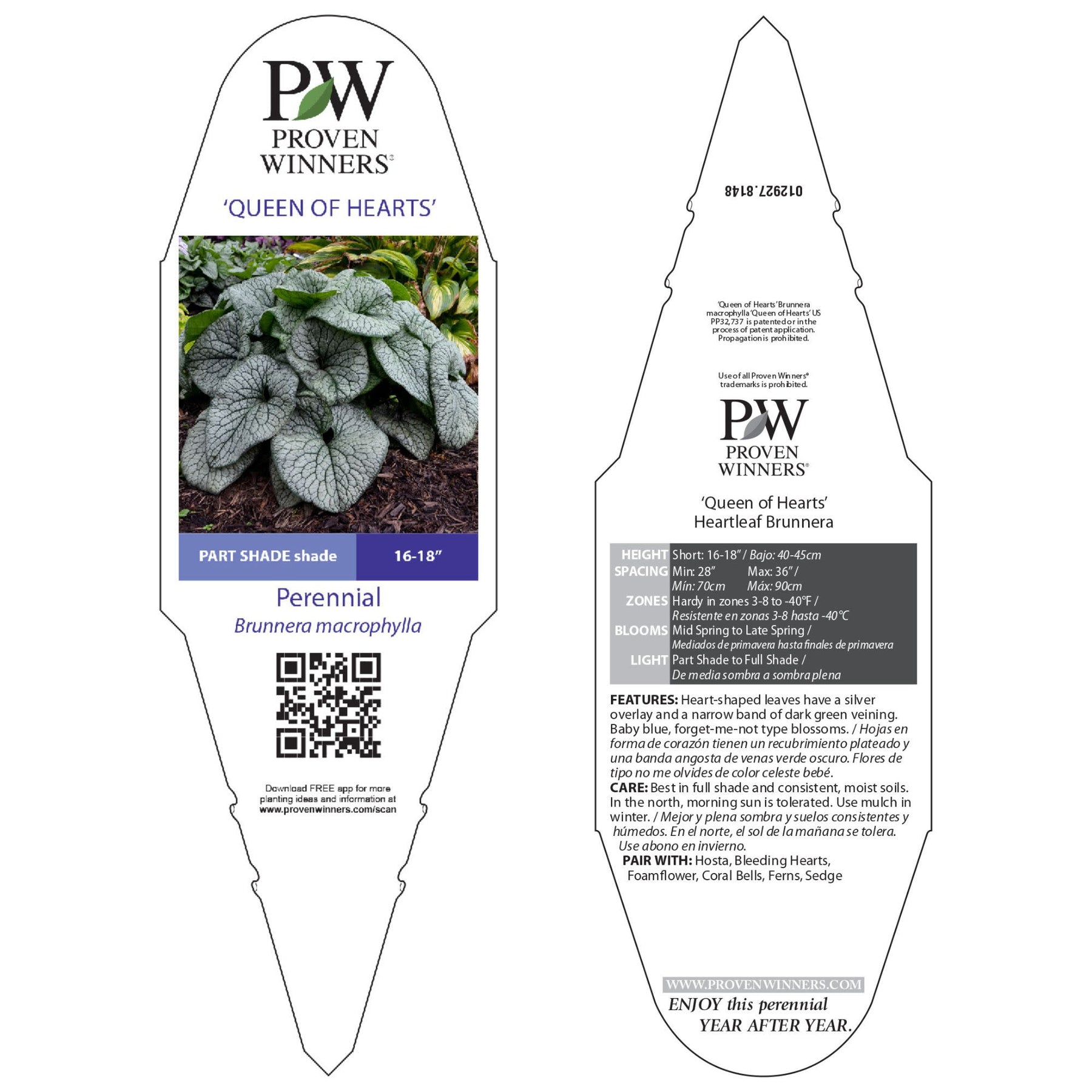 Meet 'Queen of Hearts,' the regal beauty that will rule your shade garden! With heart-shaped leaves that feature a more pronounced silver overlay and delicate dark green veining, this perennial adds a touch of elegance to any space. In mid to late spring, clusters of baby blue, forget-me-not-like blooms rise above the foliage, bringing a soft, charming pop of color. As a classic, shade-tolerant perennial, 'Queen of Hearts' is a treasure that combines stunning foliage with beautiful blooms—making it a must-have for any garden!