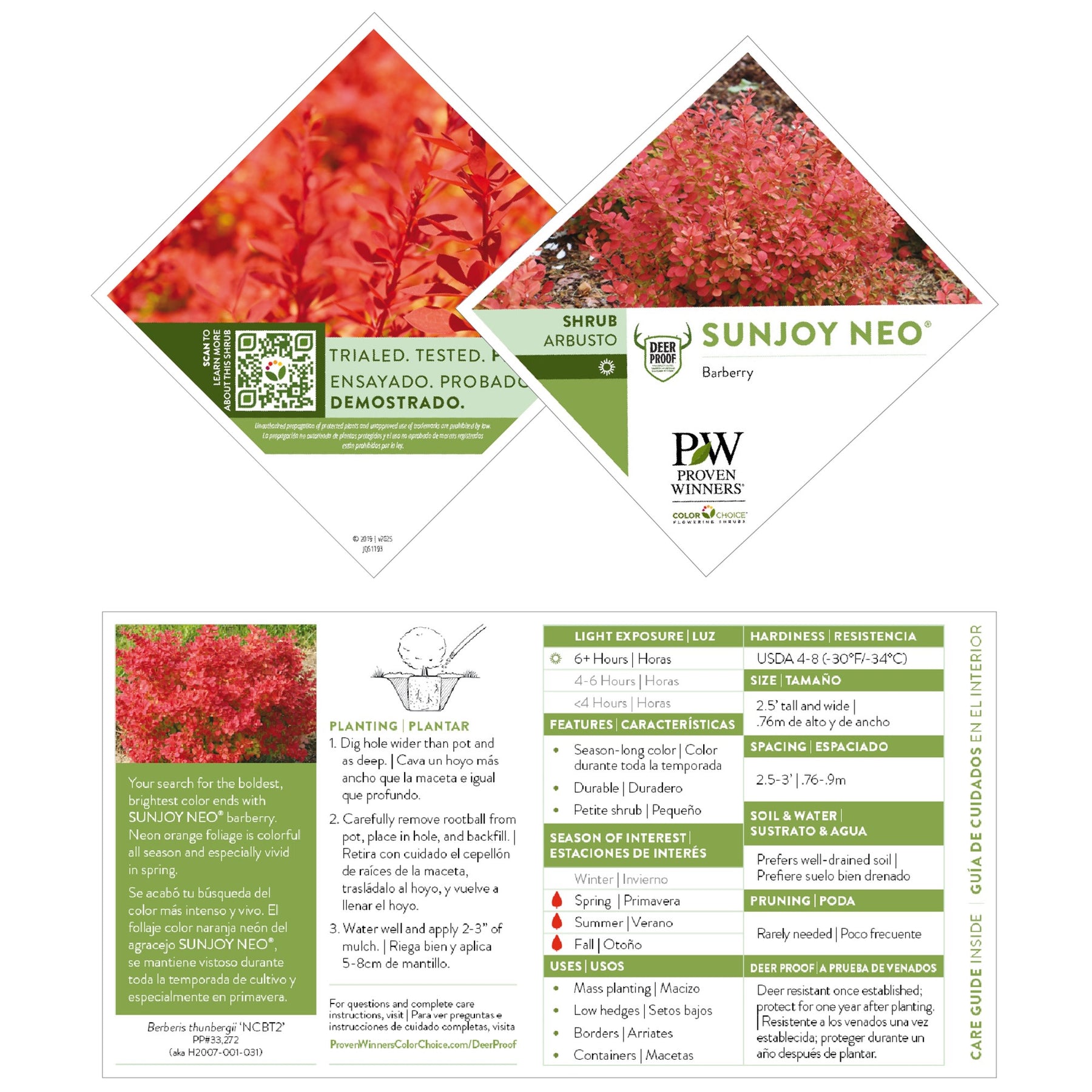 Experience the vibrant and bold statement of Sunjoy®Neo barberry. With its bright orange foliage, this sun-loving and durable plant will stand out in any landscape. Resistant to deer and unbothered by pests and diseases, it naturally grows into a round shape, making it a perfect addition to any garden.