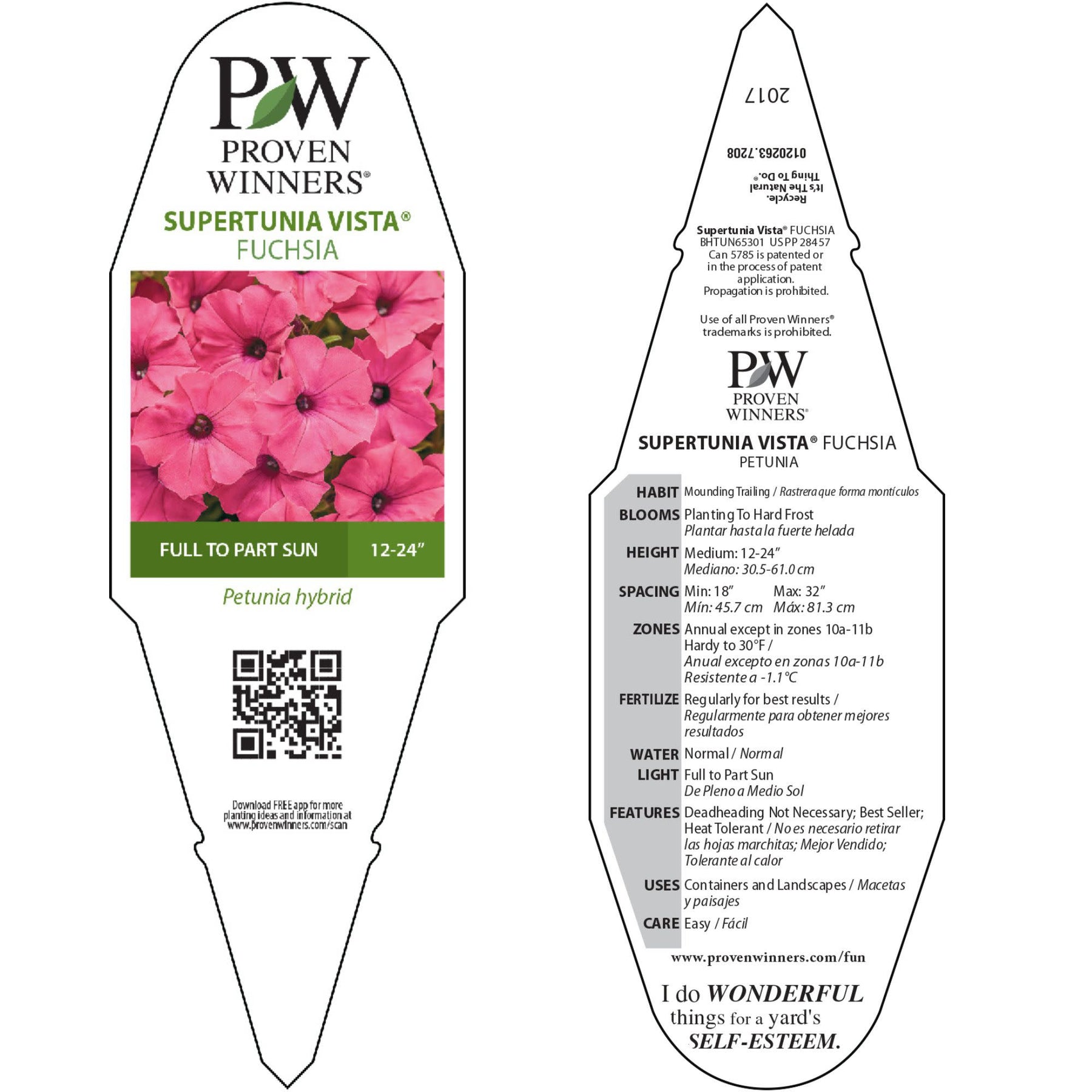 Supertunia Vista® Fuchsia is a bold beauty with vibrant, medium-sized fuchsia pink flowers that bloom all season long. Known for their vigorous growth, Supertunia Vistas are fantastic landscape plants, adding a burst of color to large containers where they act as both fillers and spillers. In garden beds, they work wonderfully in the front or middle, creating a striking focal point. Heat and drought-tolerant, this lively annual also attracts butterflies and hummingbirds, making it a perfect choice for adding charm and life to your outdoor space. A true showstopper that thrives with minimal care!