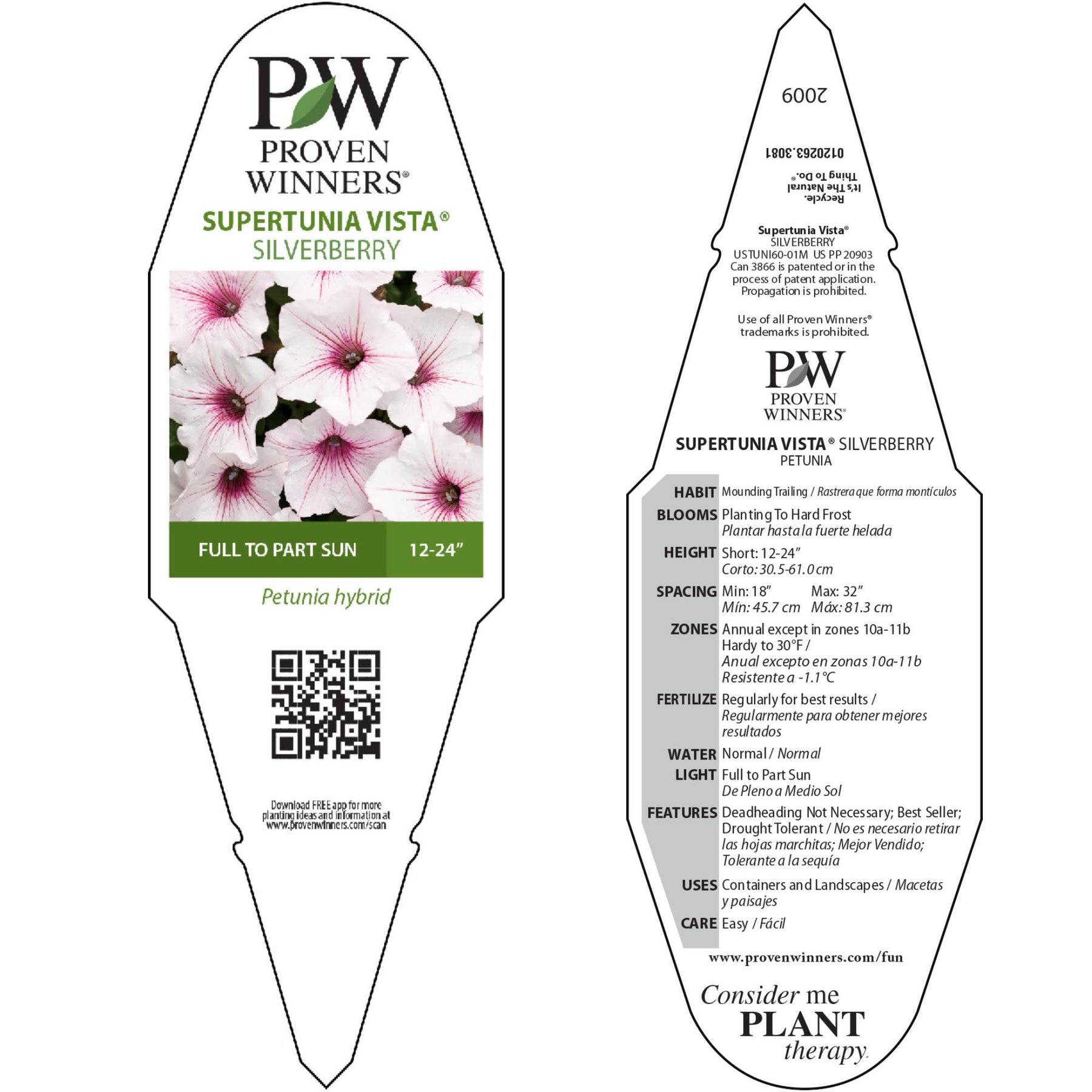 Supertunia Vista® Silverberry is a stunning petunia with pure white flowers accented by vibrant pink veins, creating a striking contrast that’s sure to catch the eye. This award-winning variety is not only a visual delight but also attracts butterflies and hummingbirds, adding life to your garden. Vigorous and heat- and drought-tolerant, Supertunia Vista® Silverberry thrives with minimal care. Its slightly mounded habit makes it perfect as both a filler and spiller in containers, or as a standout plant near the front of landscape beds. A versatile beauty that brings effortless charm and color to any space!